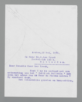 Kunt U mij in verband met zijn medewerking aan het ‘Critisch Bulletin’ ook even het adres van de Heer du Perron melden? Bij voorbaat dank.