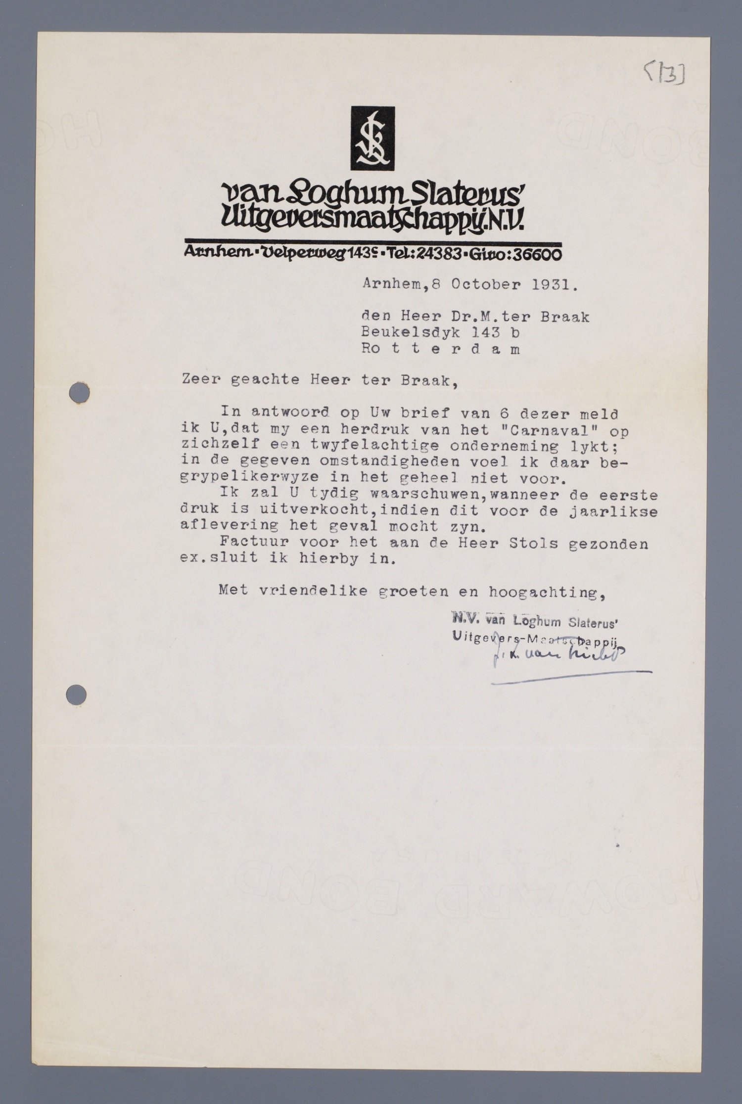 In antwoord op Uw brief van 6 dezer meld ik U, dat my een herdruk van het ‘Carnaval’ op zichzelf een twyfelachtige onderneming lykt; in de gegeven omstandigheden voel ik daar begrypelykerwyze in het geheel niet voor.