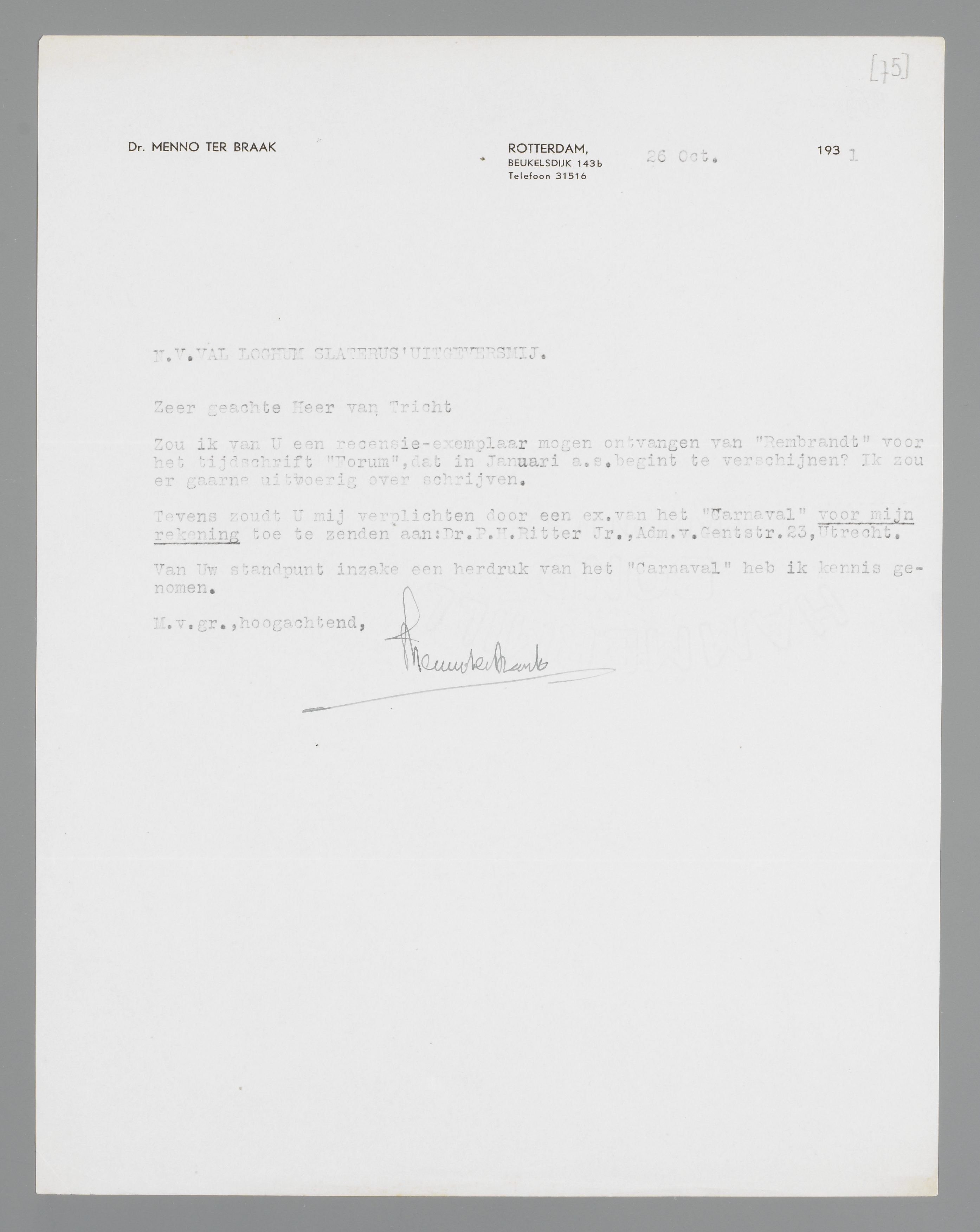 Zou ik van U een recensie-exemplaar mogen ontvangen van ‘Rembrandt’ voor het tijdschrift ‘Forum’, dat in Januari a.s. begint te verschijnen? Ik zou er gaarne uitvoerig over schrijven.