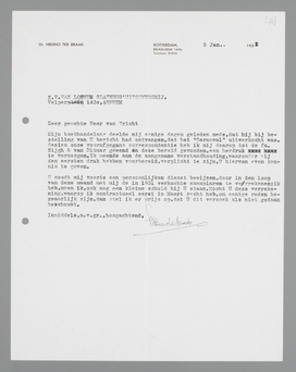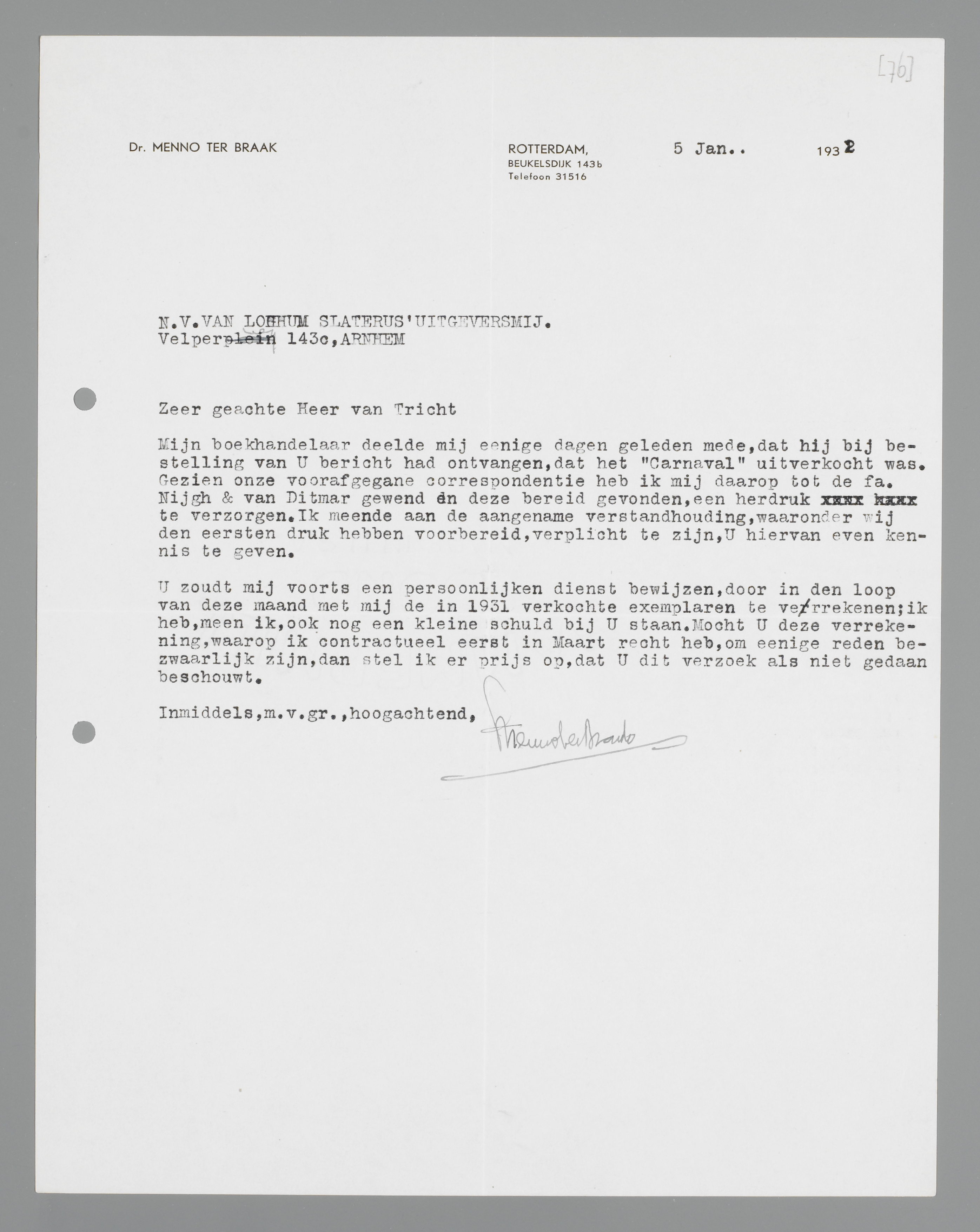 Mijn boekhandelaar deelde mij eenige dagen geleden mede, dat hij bij bestelling van U bericht had ontvangen, dat het ‘Carnaval’ uitverkocht was. Gezien onze voorafgegane correspondentie heb ik mij daarop tot de fa. Nijgh & van Ditmar gewend en deze bereid gevonden, een herdruk te verzorgen. Ik meende aan de aangename verstandhouding, waaronder wij den eersten druk hebben voorbereid, verplicht te zijn, U hiervan even kennis te geven.