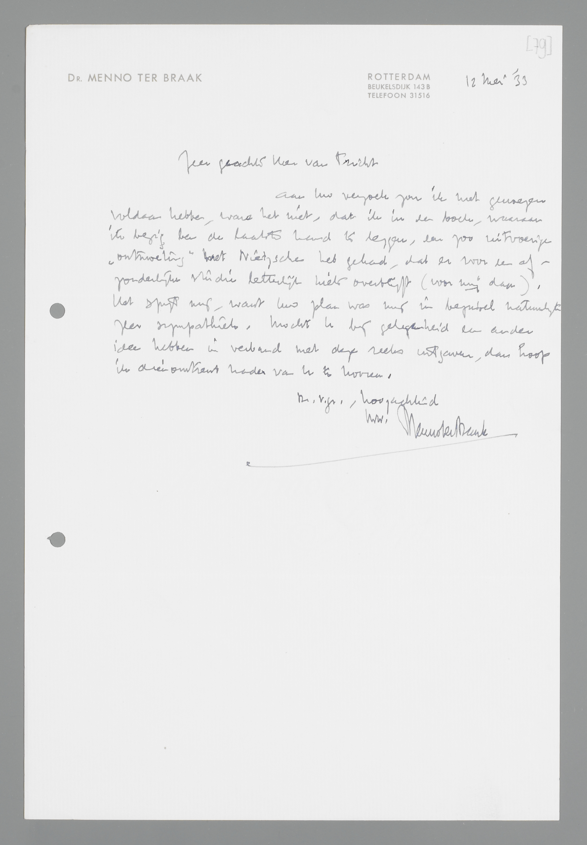 Aan Uw verzoek zou ik met genoegen voldaan hebben, ware het niet, dat ik in een boek, waaraan ik bezig ben de de laatste hand te leggen, een zoo uitvoerige ‘ontmoeting’ met Nietzsche heb gehad, dat er voor den afzonderlijke studie letterlijk niets overblijft (voor mij dan). Het spijt mij, want Uw plan was mij in beginsel natuurlijk zeer sympathiek. Moch U bij gelegenheid een ander idee hebben in verband met deze reeks uitgaven, dan hoop ik dienomtrent nader van U te hooren.