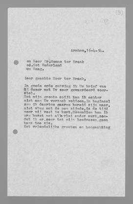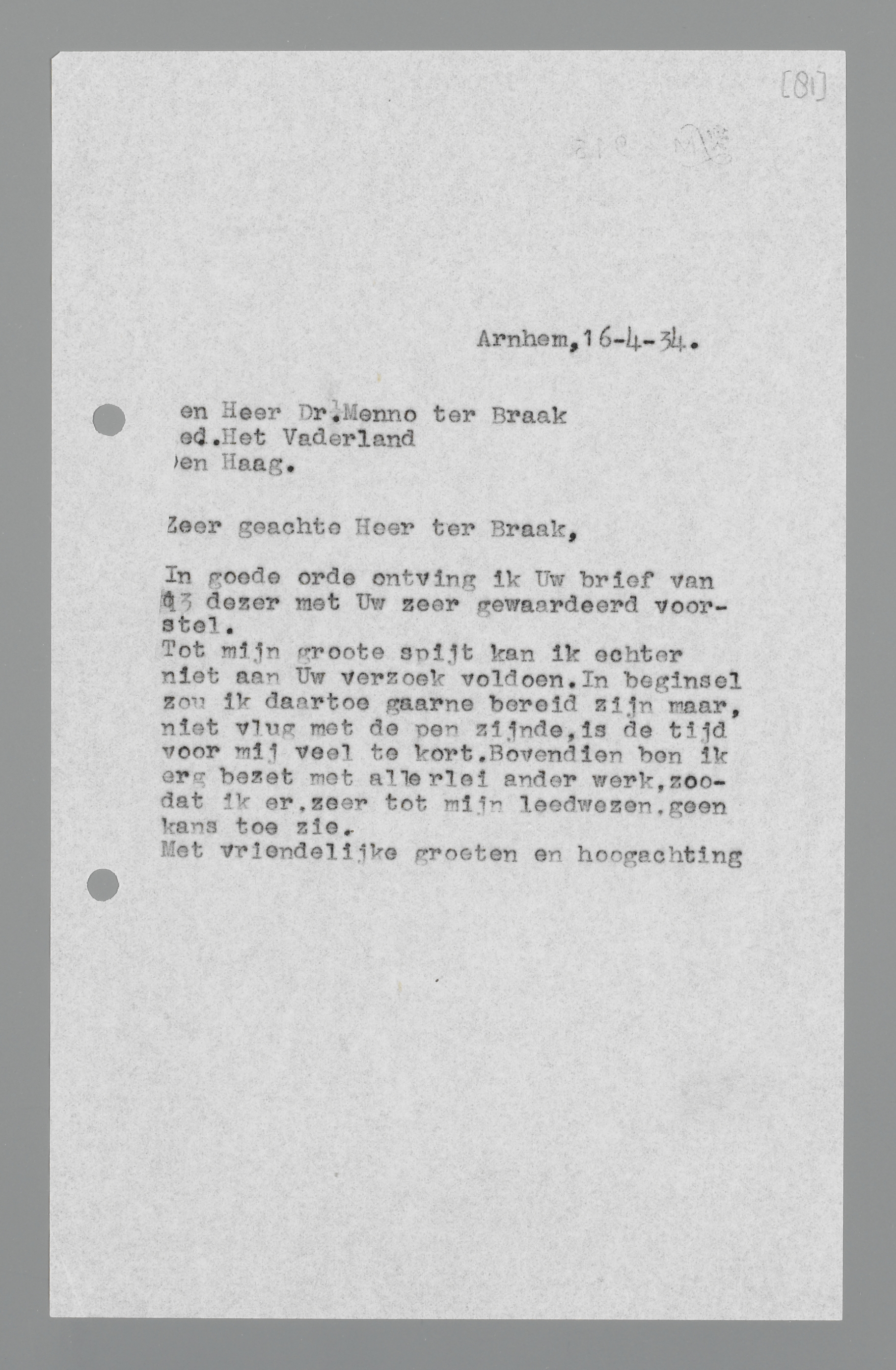 Tot mijn grote spijt kan ik echter niet aan Uw verzoek voldoen. In beginsel zou ik daartoe gaarne bereid zijn maar, niet vlug met de pen zijnde, is de tijd voor mij veel te kort. Bovendien ben ik erg bezet met allerlei ander werk, zoodat ik er, zeer tot mijn leedwezen, geen kans toe zie.