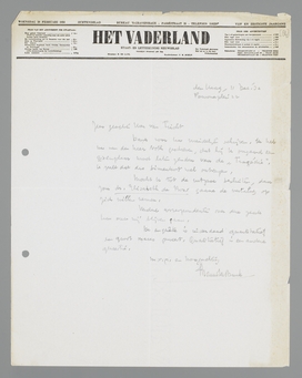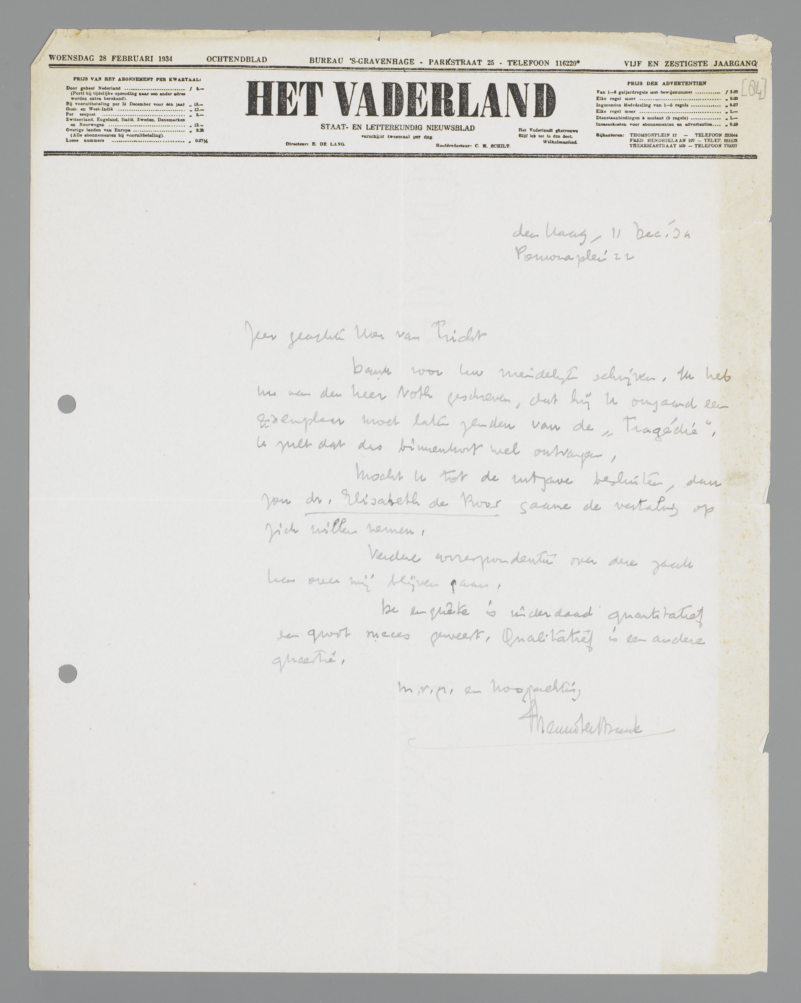 Dank voor Uw vriendelijk schrijven. Ik heb nu aan den heer Noth geschreven, dat hij U omgaand een exemplaar moet laten zenden van de ‘Tragedie’, U zult dat dus binnenkort wel ontvangen.