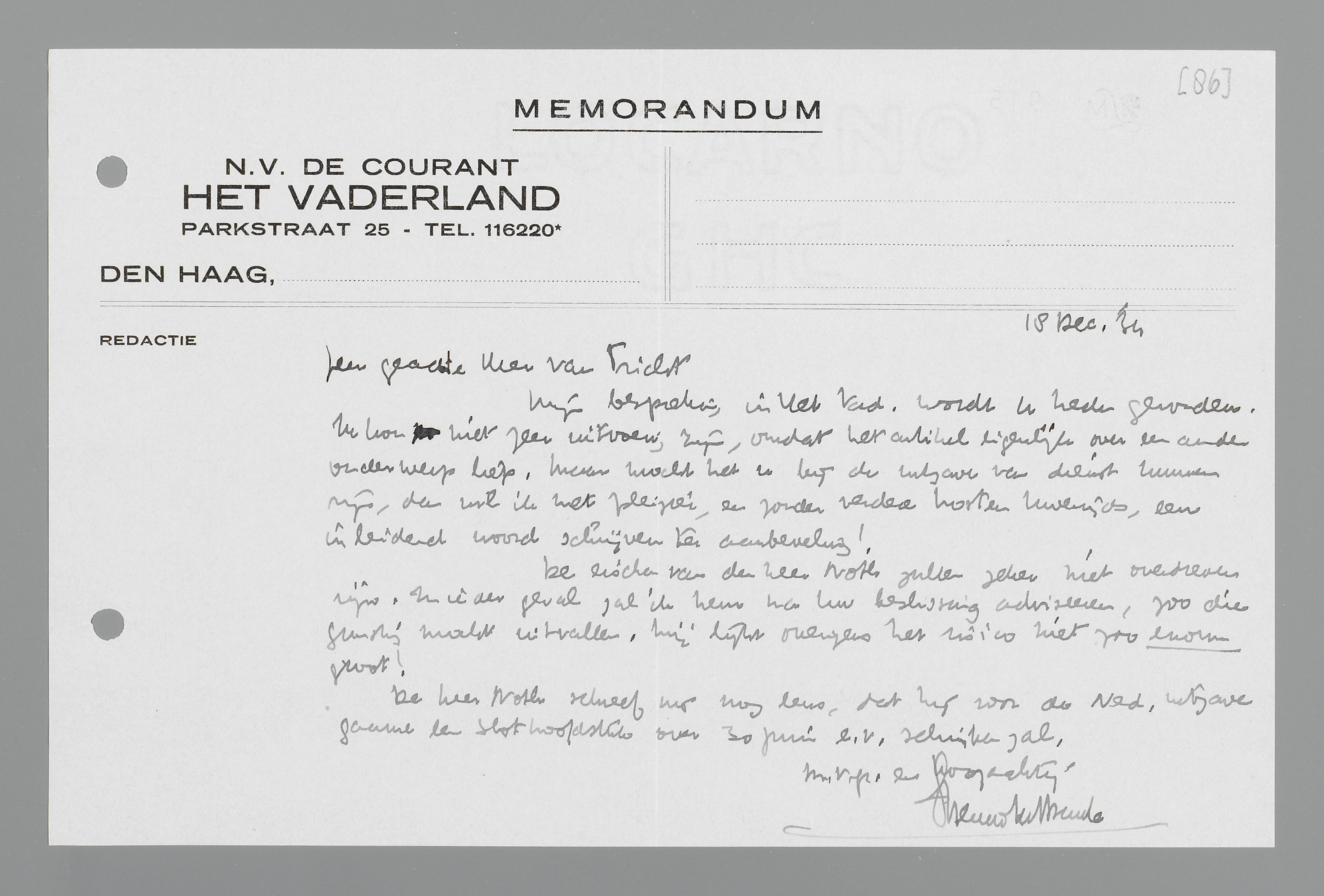 Mijn bespreking in Het Vad. wordt U heden gezonden. Ik kon niet zeer uitvoerig zijn, omdat het artikel eigenlijk over een ander onderwerp liep. Maar mocht het U bij de uitgave van dienst kunnen zijn, dan wil ik met pleizier, en zonder verdere kosten Uwerzijds, een inleidend woord schrijven ter aanbeveling!