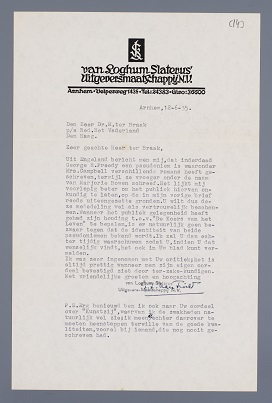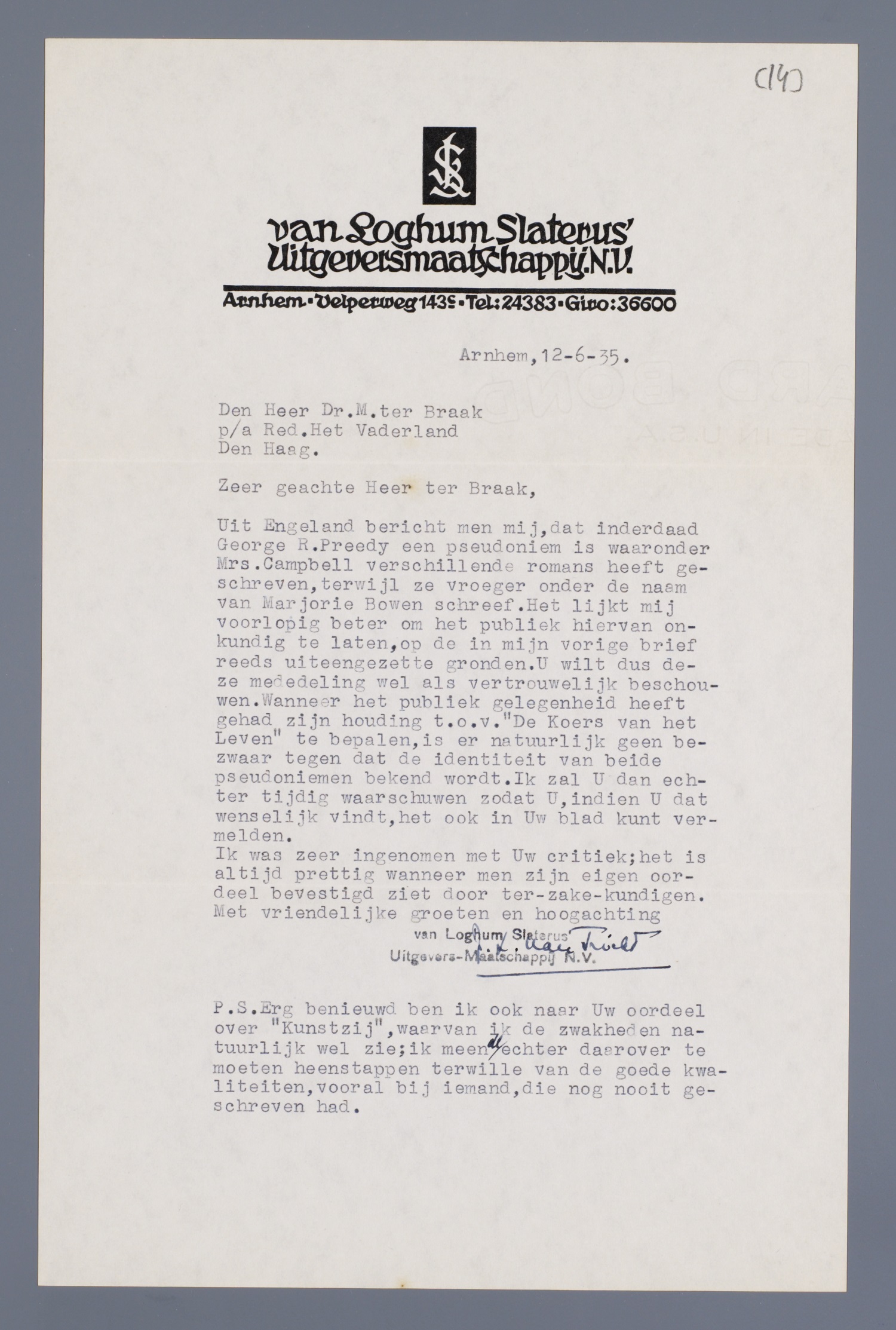 Uit Engeland bericht men mij, dat inderdaad George R. Preedy een pseudoniem is waaronder Mrs. Campbell verschillende romans heeft geschreven, terwijl ze vroeger onder de naam van Marjorie Bowen schreef. Het lijkt mij voorlopig beter om het publiek hiervan onkundig te laten, op de in mijn vorige brief reeds uiteengezette gronden. U wilt dus deze mededeling wel als vertrouwelijk beschouwen. Wanneer het publiek gelegenheid heeft gehad zijn houding t.o.v. ‘De Koers van het Leven’ te bepalen, is er natuurlijk geen bezwaar tegen dat de identiteit van beide pseudoniemen bekend wordt. Ik zal U dan echter tijdig waarschuwen zodat U, indien U dat wenselijk vindt, het ook in Uw blad kunt vermelden.