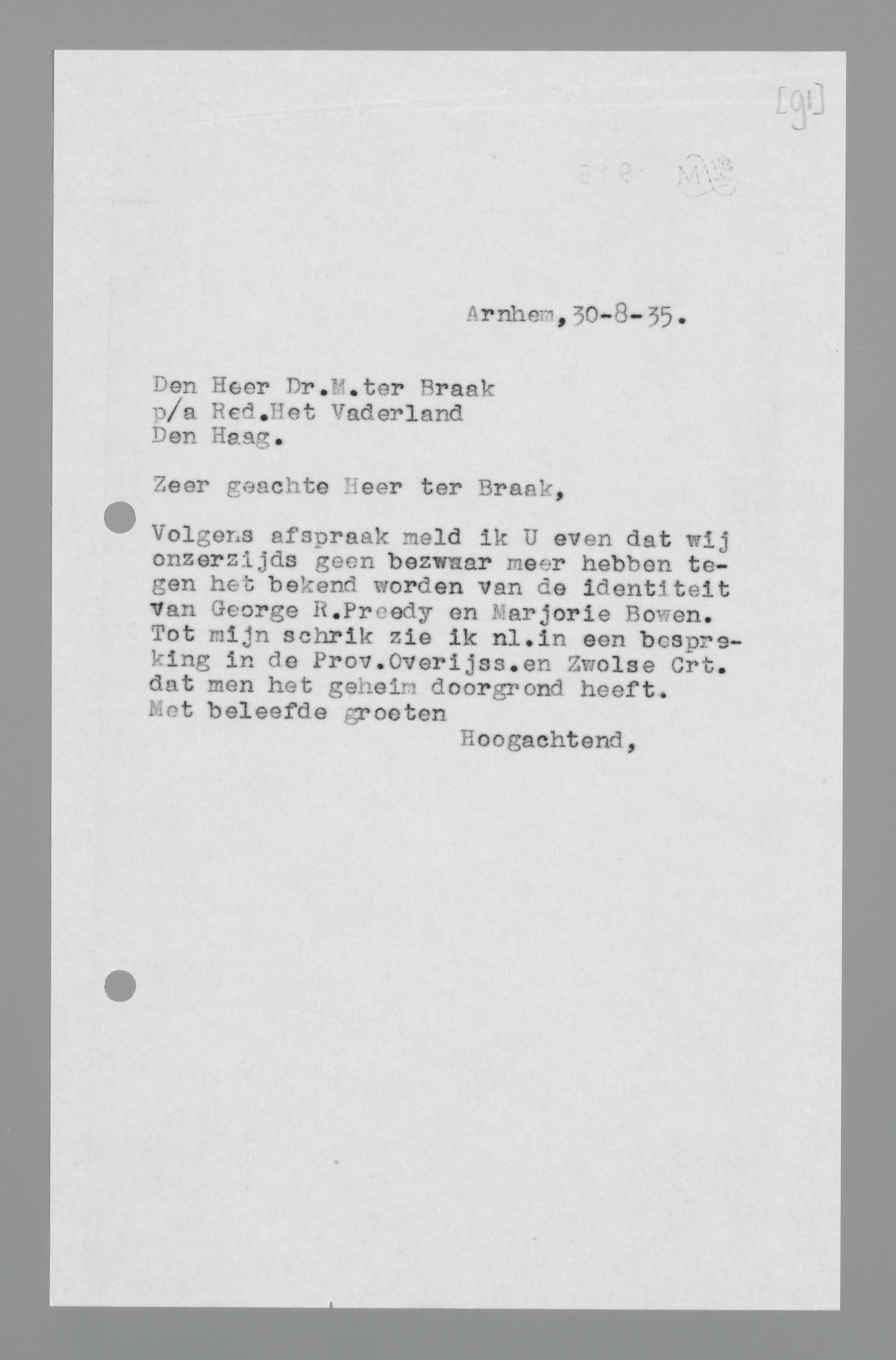 Volgens afspraak meld ik U even dat wij onzerzijds geen bezwaar meer hebben tegen het bekend worden van de identiteit van George R. Preedy en Marjorie Bowen. Tot mijn schrik zie ik nl. in een bespreking in de Prov. Overijss. en Zwolse Crt. dat men het geheim doorgrond heeft.