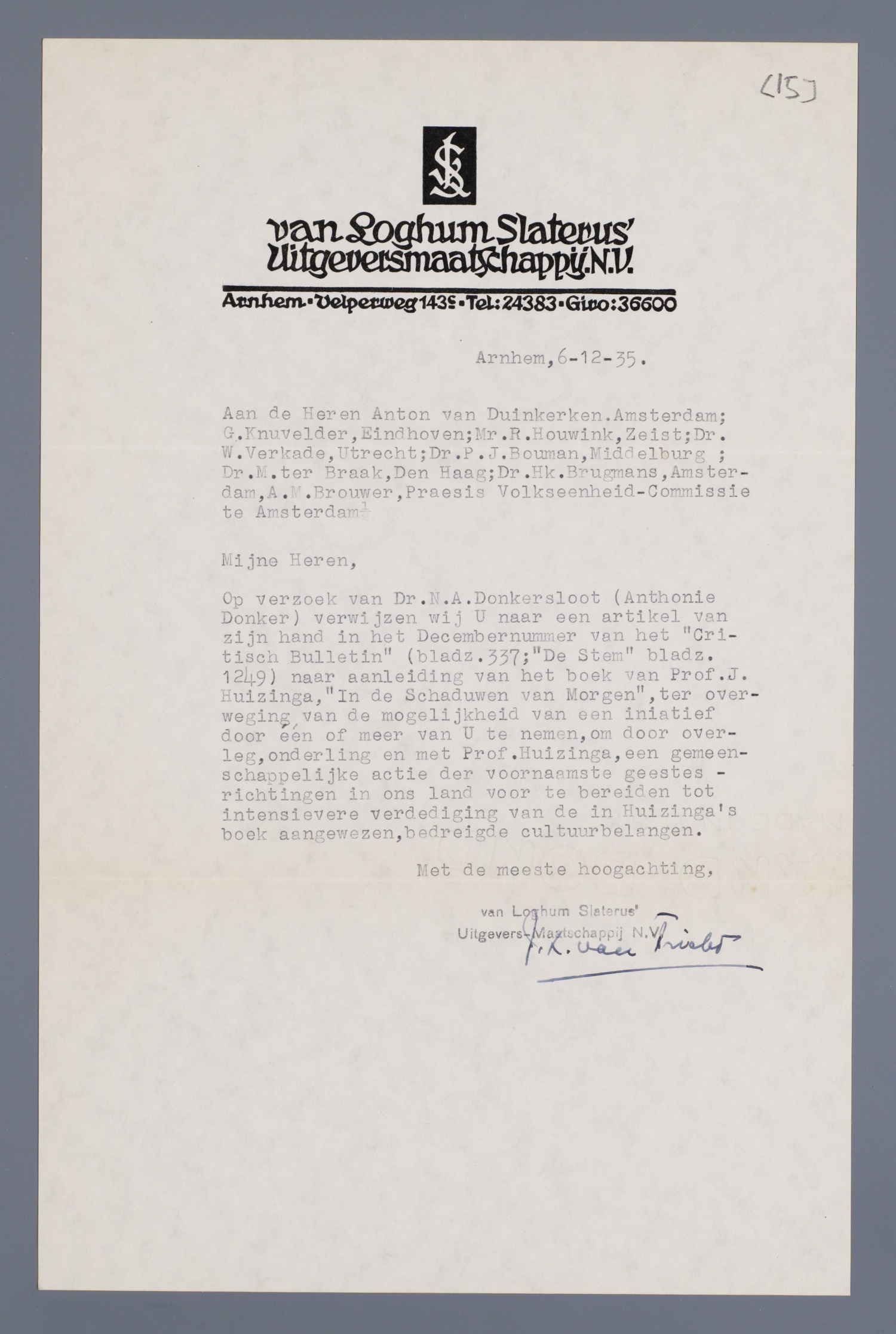 Op verzoek van Dr. N.A. Donkersloot (Anthonie Donker) verwijzen wij U naar een artikel van zijn hand in het Decembernummer van het ‘Critisch Bulletin’ (bladz.337; ‘De Stem’ bladz. 1249) naar aanleiding van het boek van Prof. J. Huizinga, ‘In de schaduwen van Morgen’, ter overweging van de mogelijkheid van een initiatief door één of meer van U te nemen, om door overleg, onderling en met Prof. Huizinga, een gemeenschappelijke actie der voornaamste geestesrichtingen in ons land voor te bereiden tot intensievere verdediging van de in Huizinga's boek aangewezen, bedreigde cultuurbelangen.