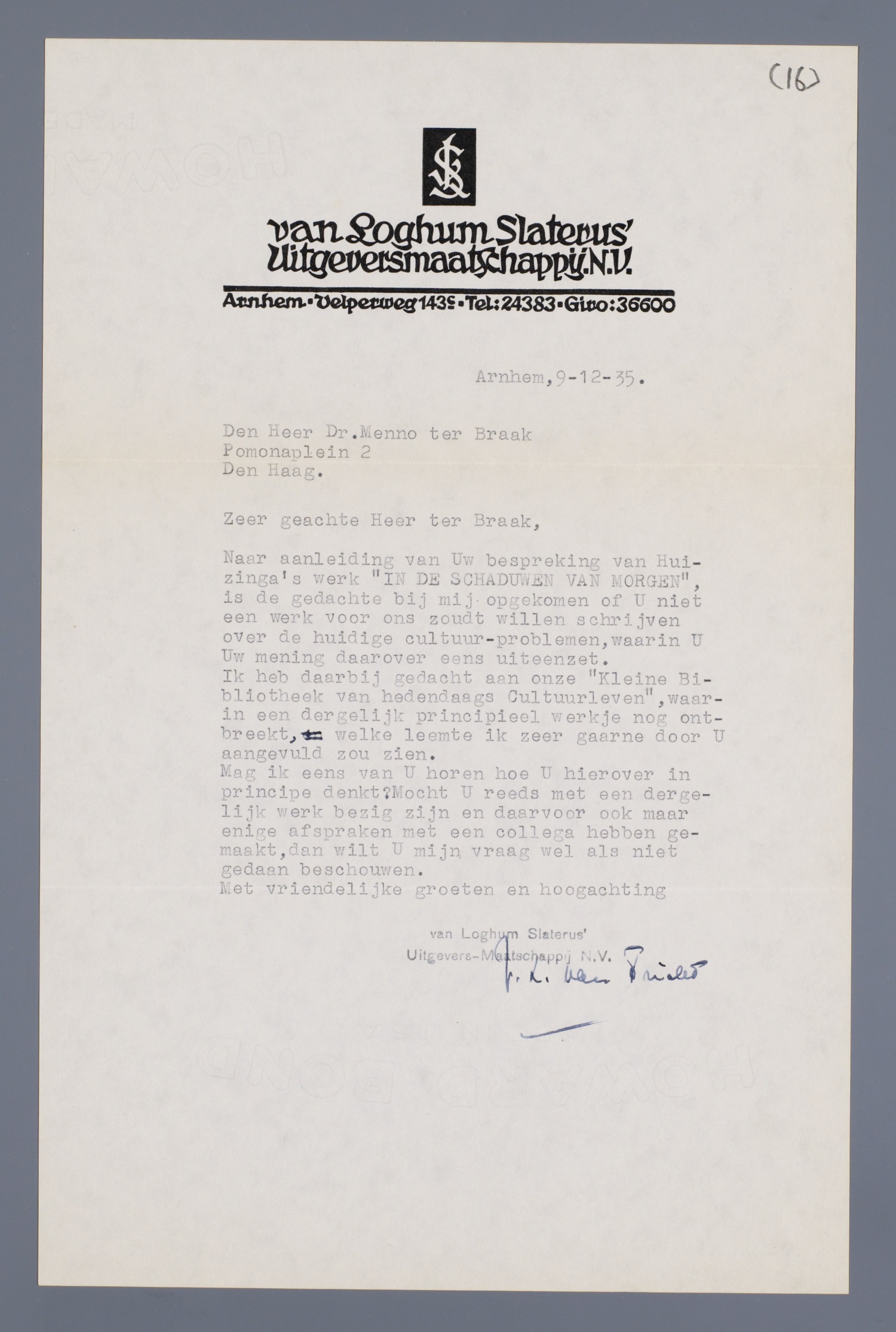 Naar aanleiding van Uw bespreking van Huizinga's werk ‘IN DE SCHADUWEN VAN MORGEN’, is de gedachte bij mij opgekomen of U niet een werk voor ons zoudt willen schrijven over de huidige cultuurproblemen, waarin U Uw mening daarover eens uiteenzet.