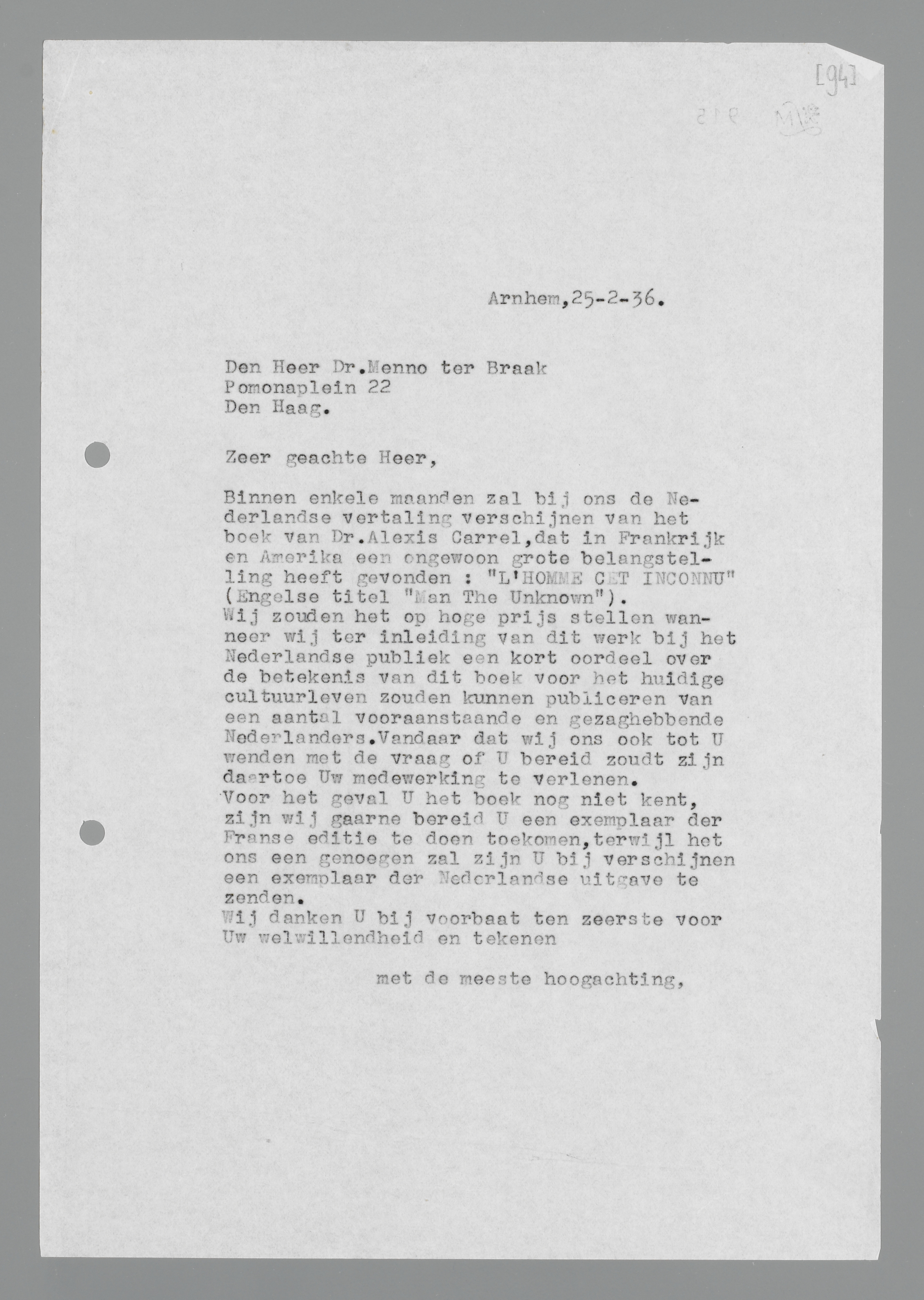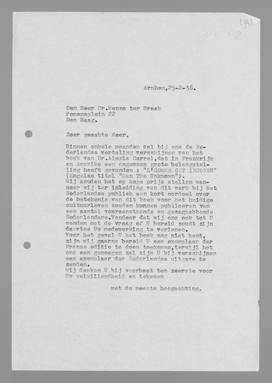 Voor het geval U het boek nog niet kent, zijn wij gaarne bereid U een exemplaar der Franse editie te doen toekomen, terwijl het ons een genoegen zal zijn U bij verschijnen een exemplaar der Nederlandse uitgave te zenden.
