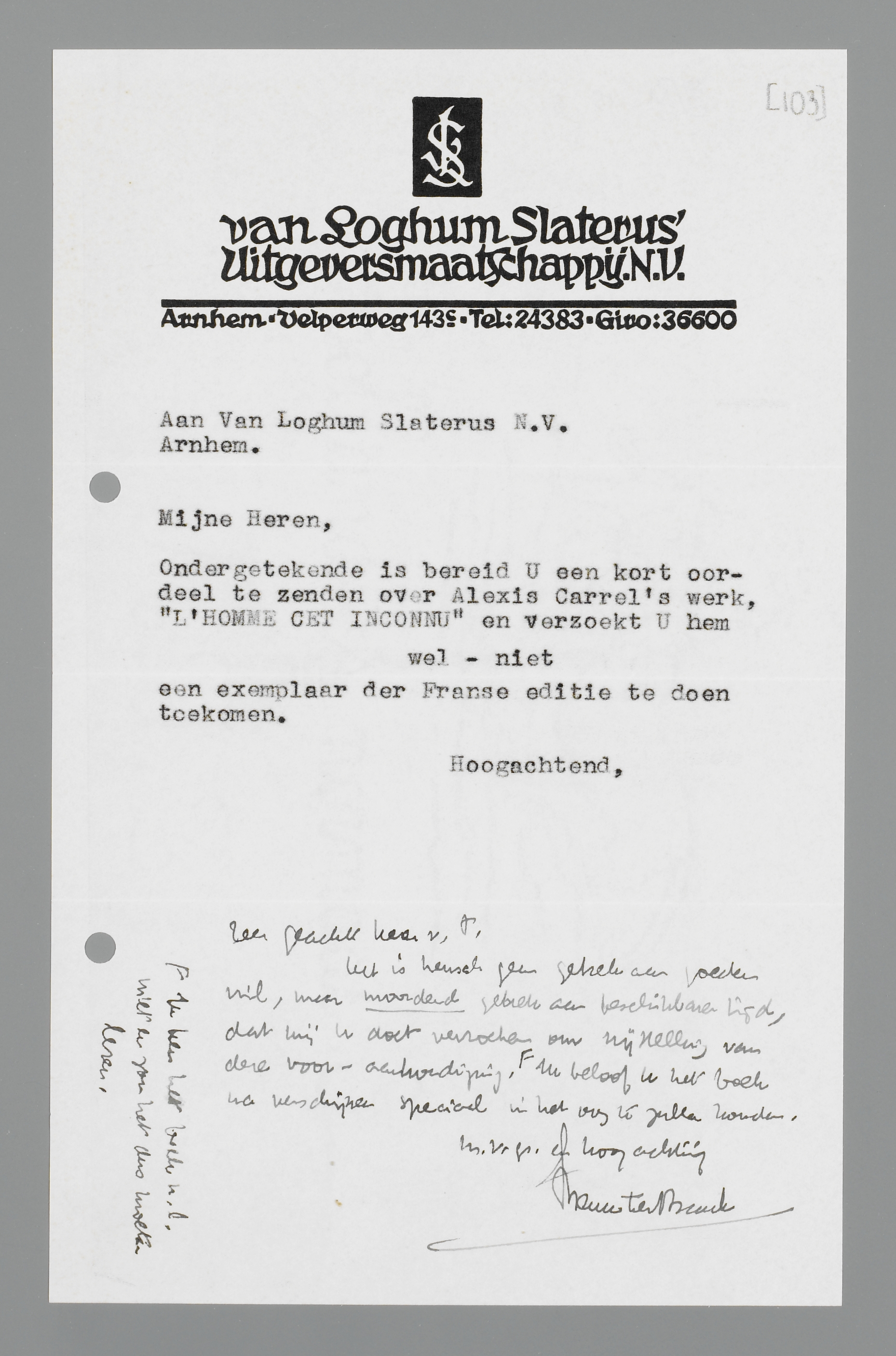 Het is heusch geen gebrek aan goeden wil, maar moordend gebrek aan beschikbare tijd, dat mij U doet verzoeken om vrijstelling van deze voor-aankondiging. <Ik ken het boek n.l. niet edition zou het dus moeten lezen.> Ik beloof U het boek na verschijnen speciaal in het oog te zullen houden.