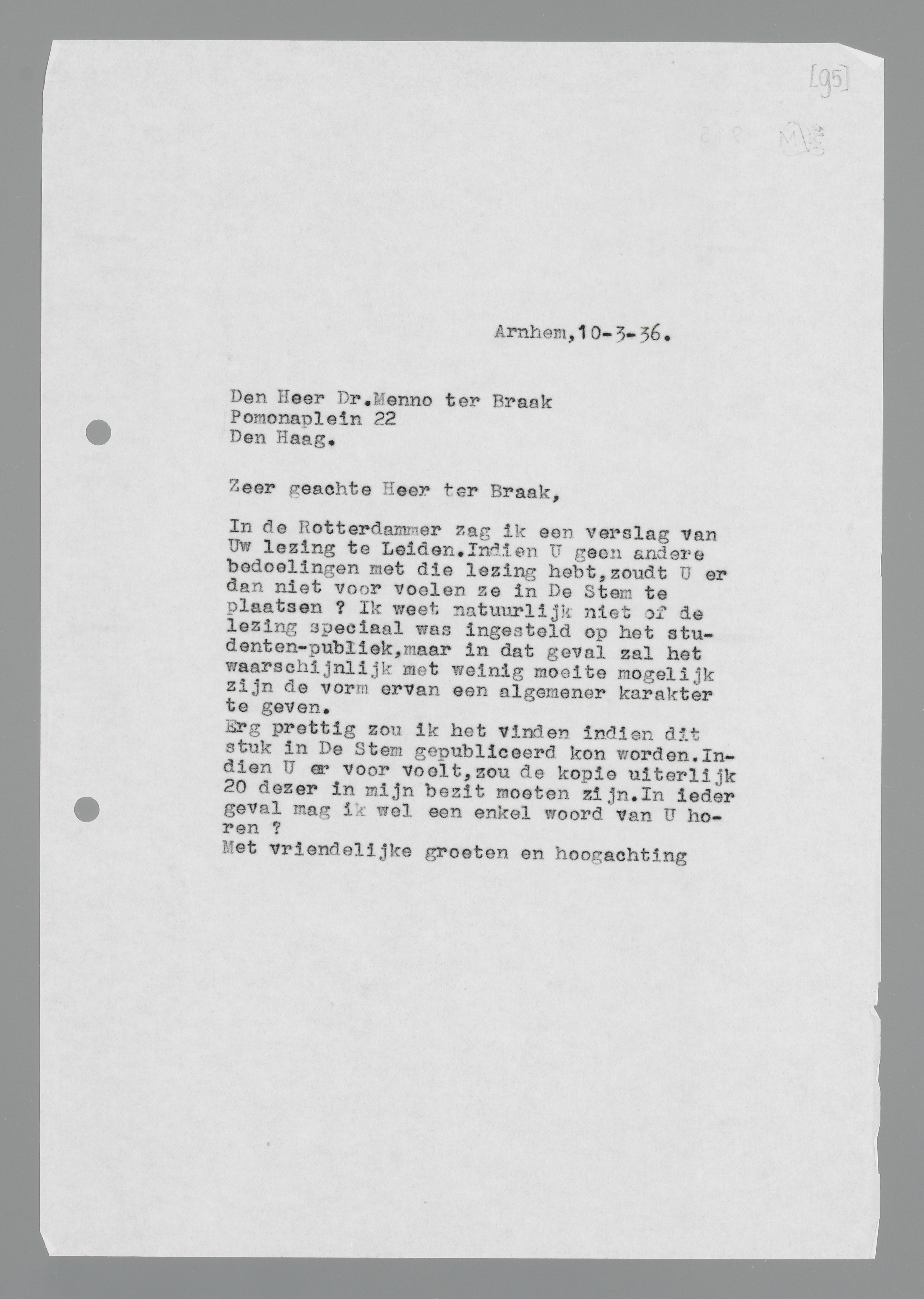 Erg prettig zou ik het vinden indien dit stuk in De Stem gepubliceerd kon worden. Indien U er voor voelt, zou de kopie uiterlijk 20 dezer in mijn bezit moeten zijn. In ieder geval mag ik wel een enkel woord van U horen?