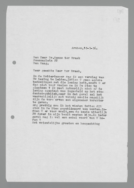In de Rotterdammer zag ik een verslag van Uw lezing te Leiden. Indien U geen andere bedoelingen met die lezing hebt, zoudt U er dan niet voor voelen ze in De Stem te plaatsen? Ik weet natuurlijk niet of de lezing speciaal was ingesteld op het studenten-publiek, maar in dat geval zal het waarschijnlijk met weinig moeite mogelijk zijn de vorm ervan een algemener karakter te geven.