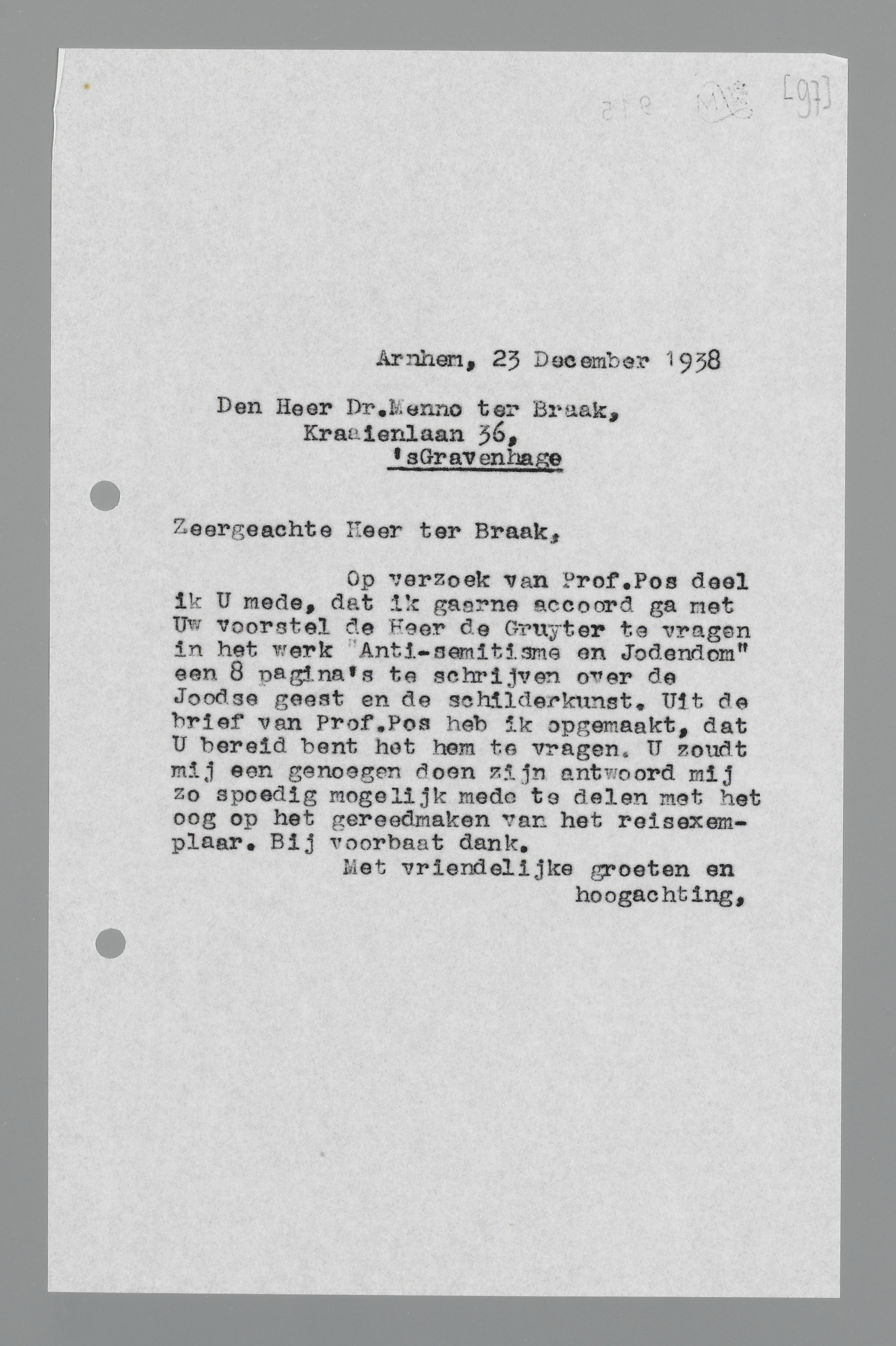 Op verzoek van Prof. Pos deel ik u mede, dat ik gaarne accoord ga met uw voorstel de Heer de Gruyter te vragen in het werk ‘Anti-semitisme en Jodendom’ een 8 pagina's te schrijven over de Joodse geest en de schilderkunst. Uit de brief van Prof. Pos heb ik opgemaakt, dat U bereid bent het hem te vragen. U zoudt mij een genoegen doen zijn antwoord mij zo spoedig mogelijk mede te delen met het oog op het gereedmaken van het reisexemplaar. Bij voorbaat dank.