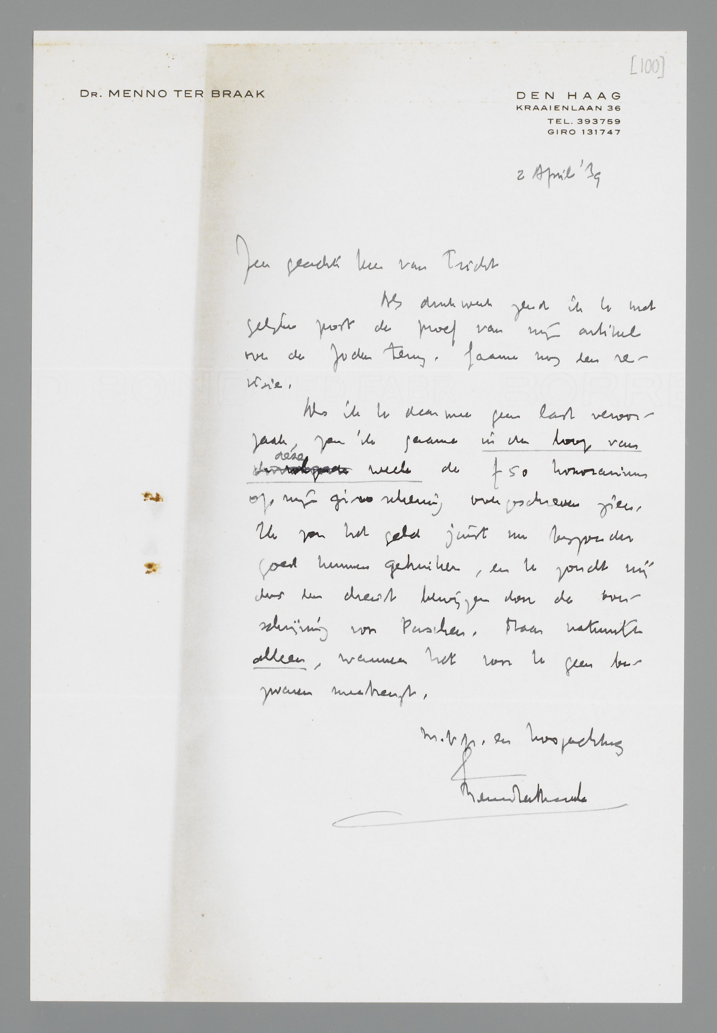 Als drukwerk zend ik U met gelijke post de proef van mijn artikel over de Joden terug. Gaarne nog een revisie.
