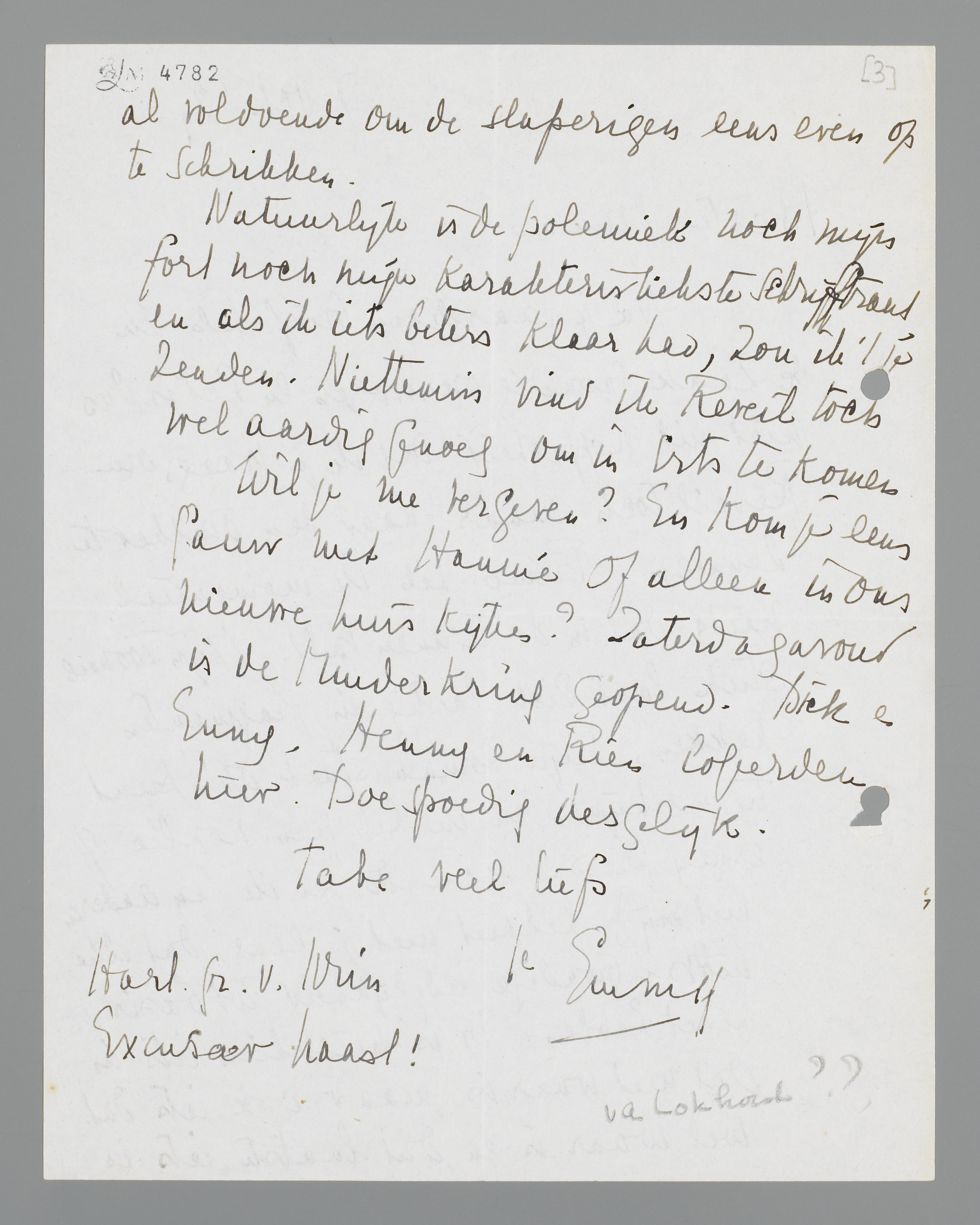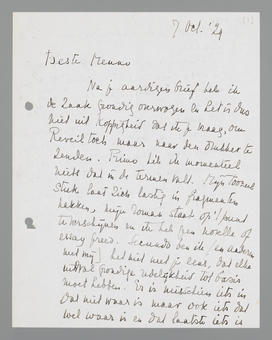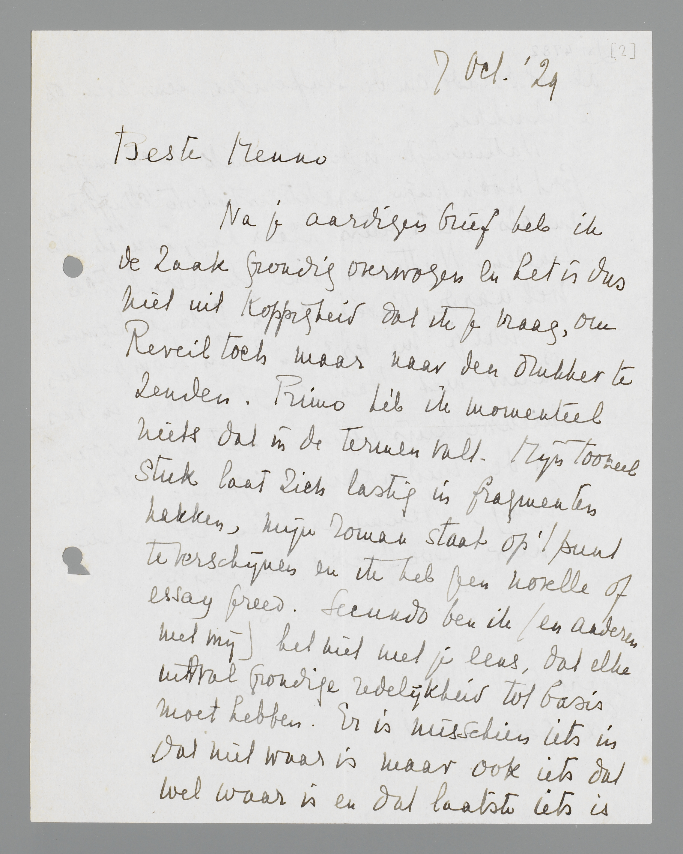 Na je aardigen brief heb ik de zaak grondig overwogen en het is dus niet uit koppigheid dat ik je vraag, om Reveil toch maar naar den drukker te zenden. Primo héb ik momenteel niets dat in de Termen valt. Mijn tooneelstuk laat zich lastig in fragmenten hakken, mijn roman staat op 't punt te verschijnen en ik heb geen novelle of essay gereed. Secundo ben ik (en anderen met mij) het niet met je eens, dat elke uitval grondige redelijkheid tot basis moet hebben. Er is misschien iets in dat niet waar is maar ook iets dat wel waar is en dat laatste iets is al voldoende om de slaperigen eens even op te schrikken.