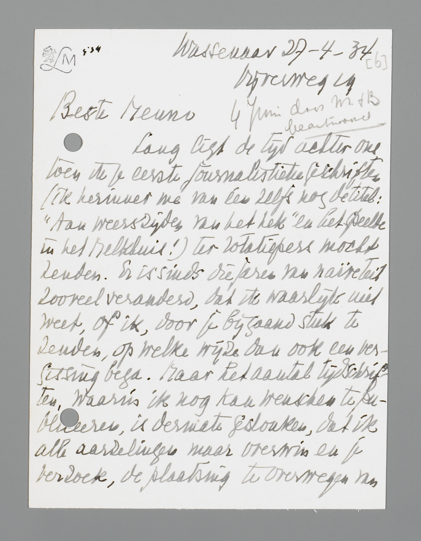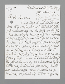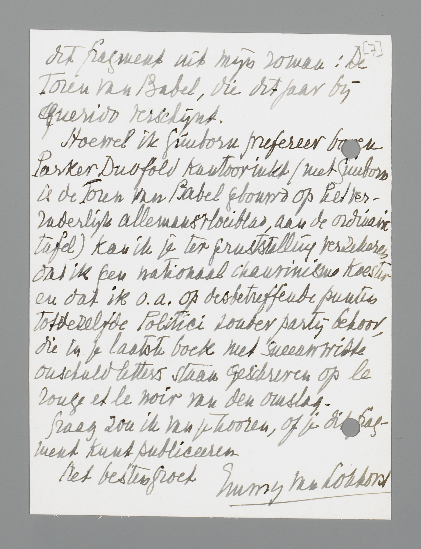 Lang ligt de tijd achter ons toen ik je eerste journalistieke geschriften (ik herinner me van éen zelfs nog de titel: ‘Aan weerszijden van het hek’ en het gedeelte in het Melkhuis!) ter rotatiepers mocht zenden. Er is sinds die jaren van naïveteit zooveel veranderd, dat ik waarlijk niet weet, of ik, door je bijgaand stuk te zenden, op welke wijze dan ook een vergissing bega. Maar het aantal tijdschriften, waarin ik nog kan wenschen te publiceeren, is dermate geslonken, dat ik alle aarzelingen maar overwin en je verzoek, de plaatsing te overwegen van dit fragment uit mijn roman: De Toren van Babel, die dit jaar bij Querido verschijnt.
