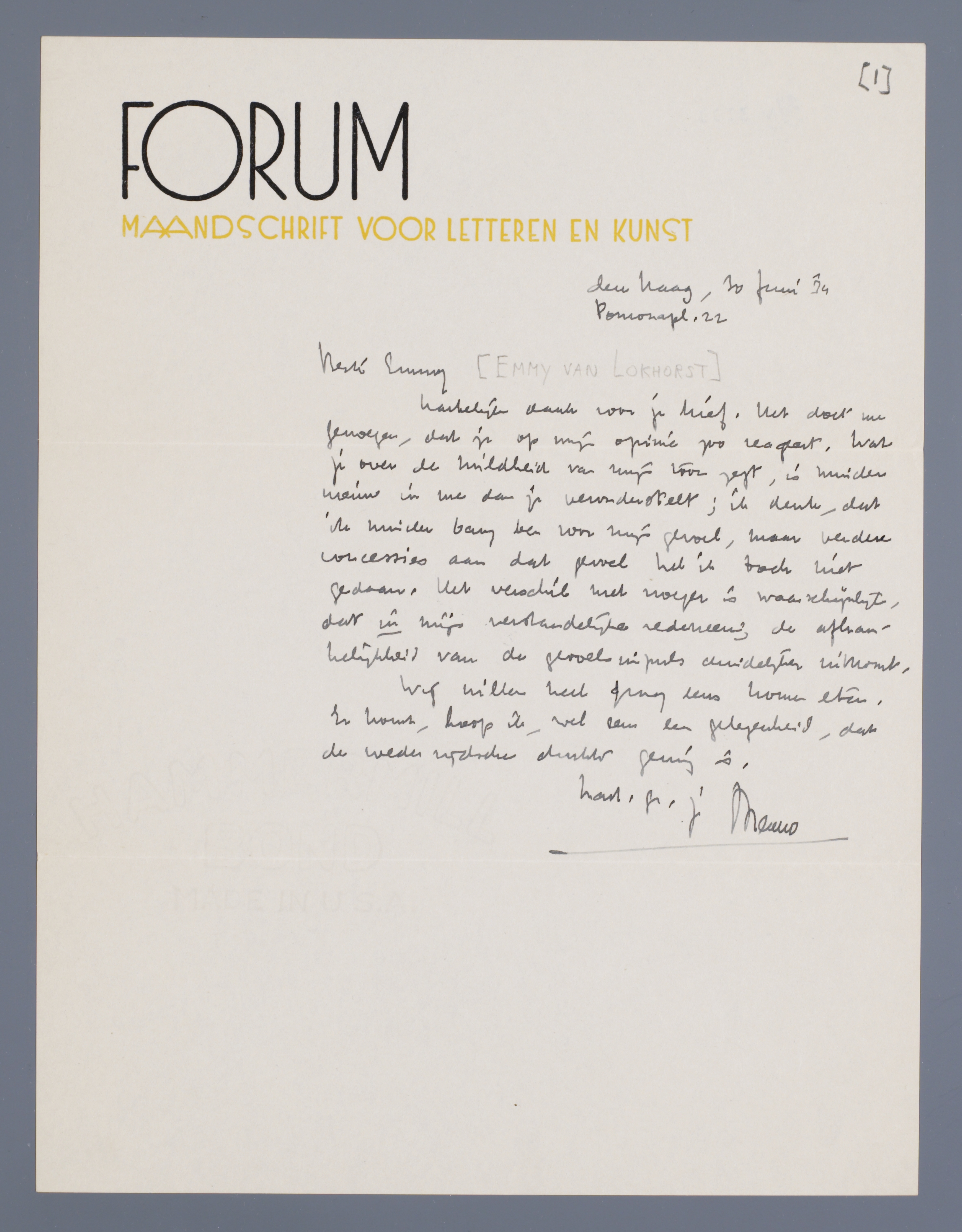 Hartelijk dank voor je brief. Het doet me genoegen, dat je op mijn opinie zoo reageert. Wat je over de mildheid van mijn toon zegt, is minder nieuw in me dan je veronderstelt; ik denk, dat ik minder bang ben voor mijn gevoel, maar verdere concessies aan dat gevoel heb ik toch niet gedaan. Het verschil met vroeger is waarschijnlijk, dat in mijn verstandelijke redeneering de afhankelijkheid van de gevoelsimpuls duidelijker uitkomt.
