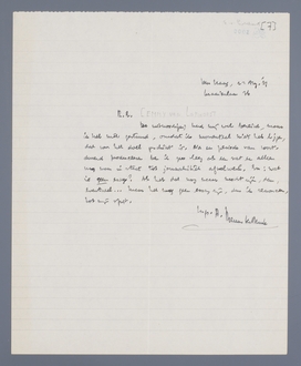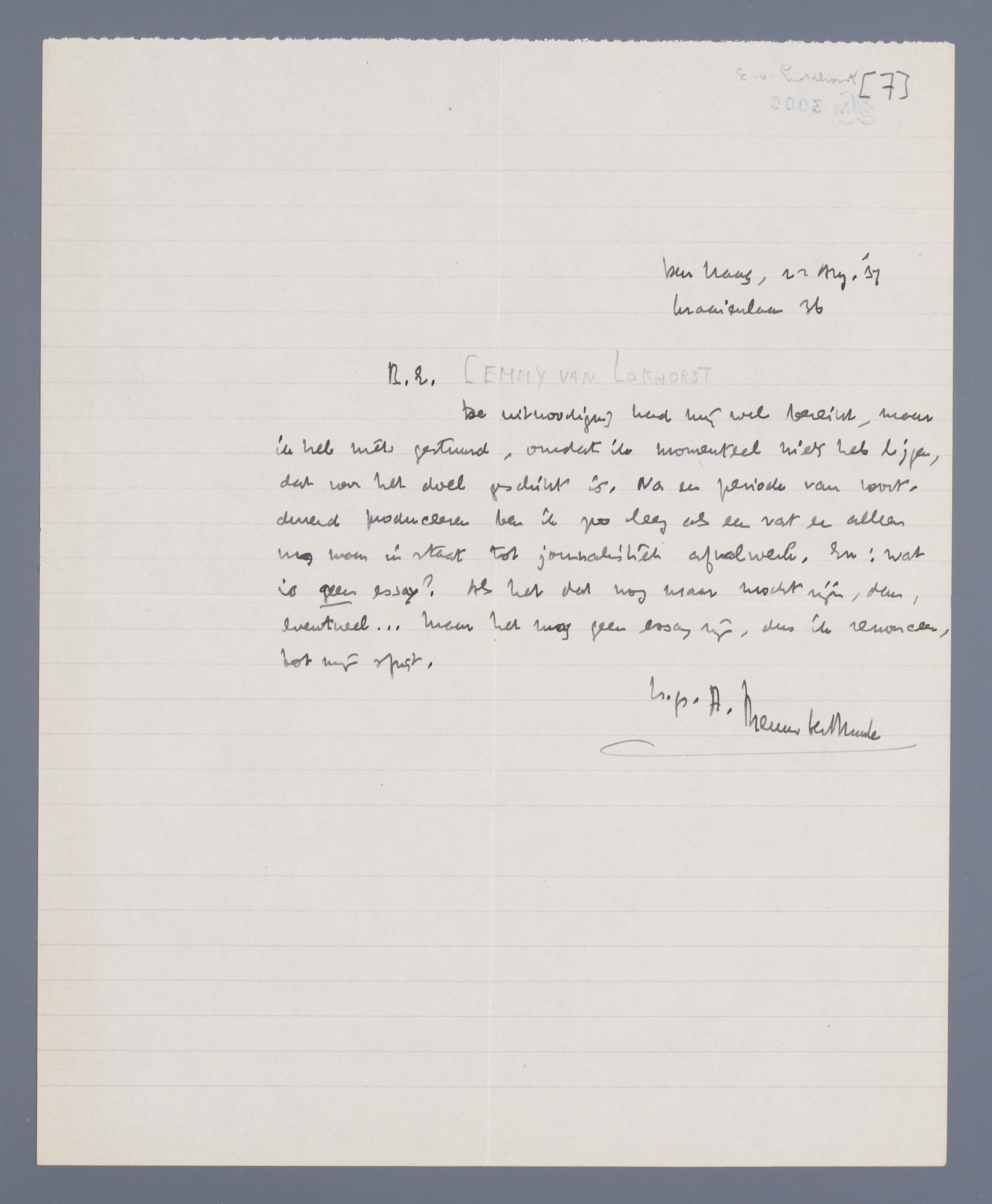De uitnoodiging had mij wel bereikt, maar ik heb niets gestuurd, omdat ik momenteel niets heb liggen, dat voor het doel geschikt is. Na een periode van voortdurend produceren ben ik zoo leeg als een vat en alleen nog maar in staat tot journalistiek afvalwerk. En: wat is geen essay? Als het dat nog maar mocht zijn, dan, eventueel... maar het mag geen essay zijn, dus ik renonceer, tot mijn spijt.