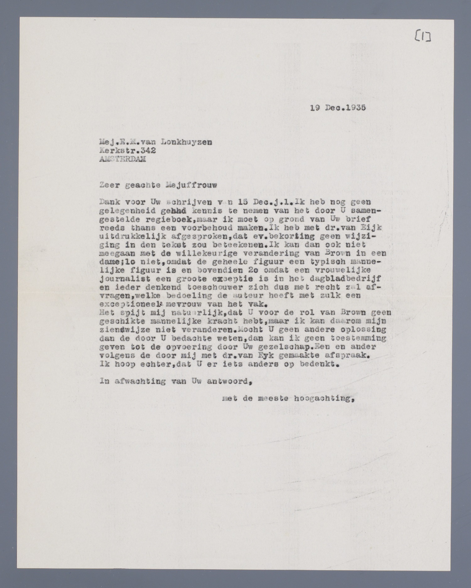 Het spijt mij natuurlijk, dat U voor de rol van Brown geen geschikte mannelijke kracht hebt, maar ik kan daarom mijn zienswijze niet veranderen. Mocht U geen andere oplossing dan de door U bedachte weten, dan kan ik geen toestemming geven tot de opvoering door Uw gezelschap. Een en ander volgens de door mij met dr. van Eyk gemaakte afspraak. Ik hoop echter, dat U er iets anders op bedenkt.