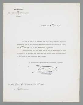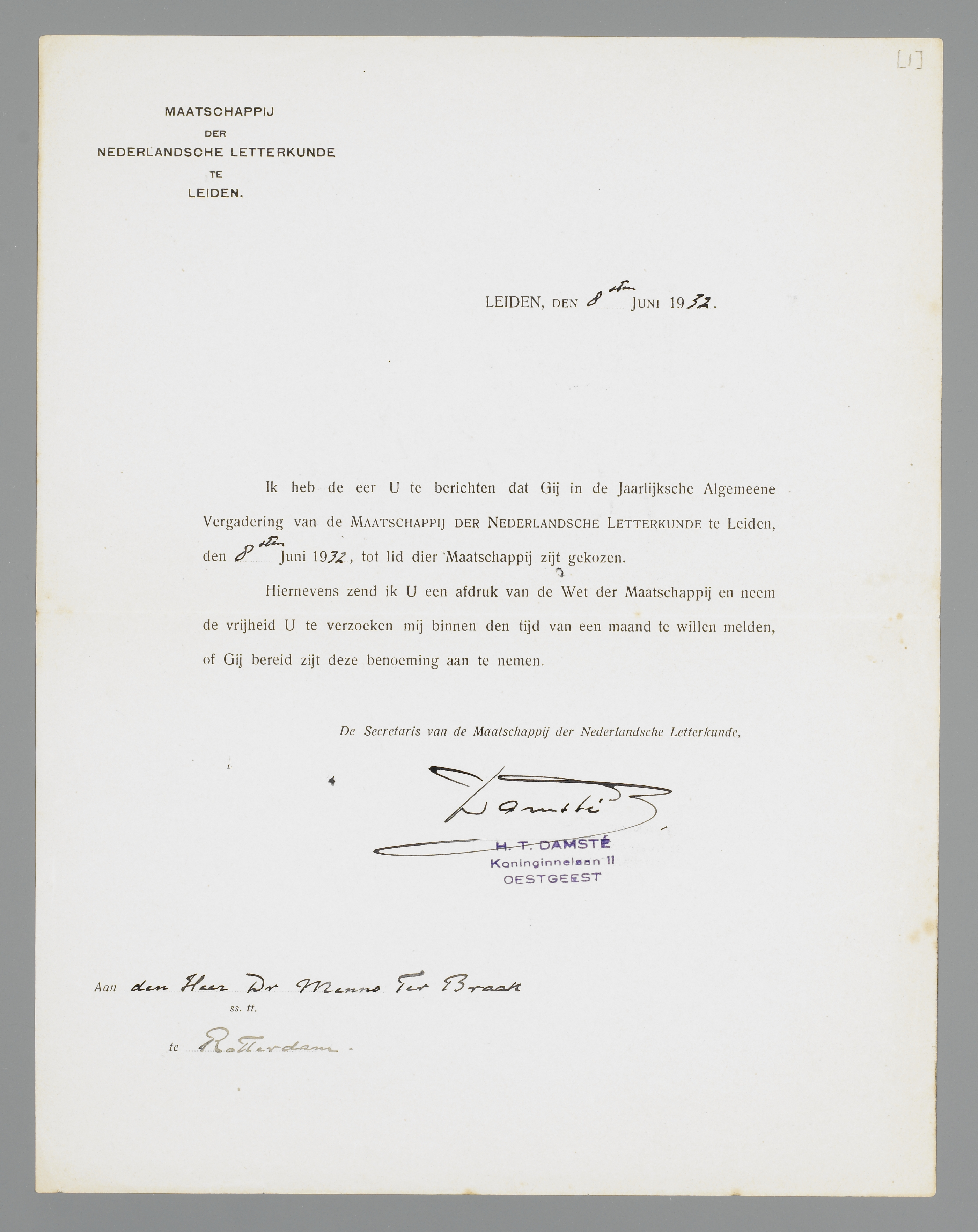 Ik heb den eer U te berichten dat Gij in de Jaarlijksche Algemeene Vergadering van de Maatschappij der Nederlandsche Letterkunde te Leiden, den 8sten Juni 1932, tot lid dier Maatschappij zijt gekozen.
