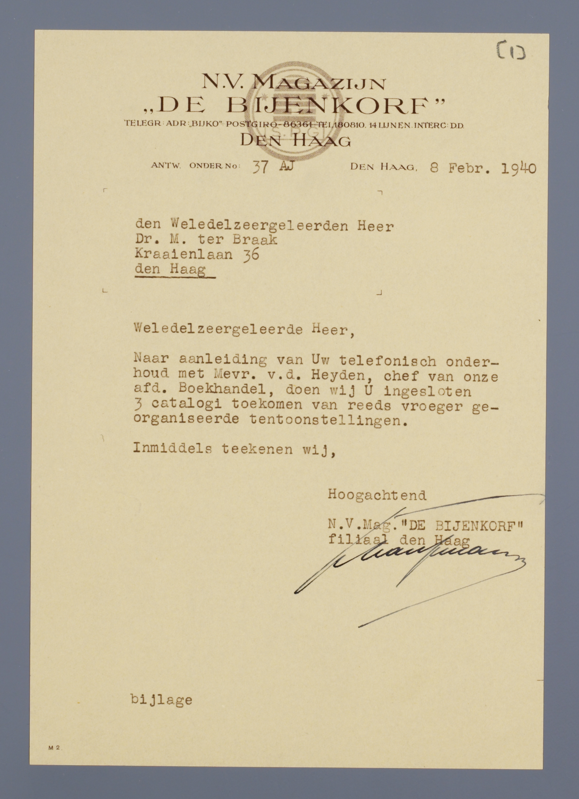Naar aanleiding van Uw telefonisch onderhoud met Mevr. v.d. Heyden, chef van onze afd. Boekhandel, doen wij U ingesloten 3 catalogi toekomen van reeds vroeger georganiseerde tentoonstellingen.