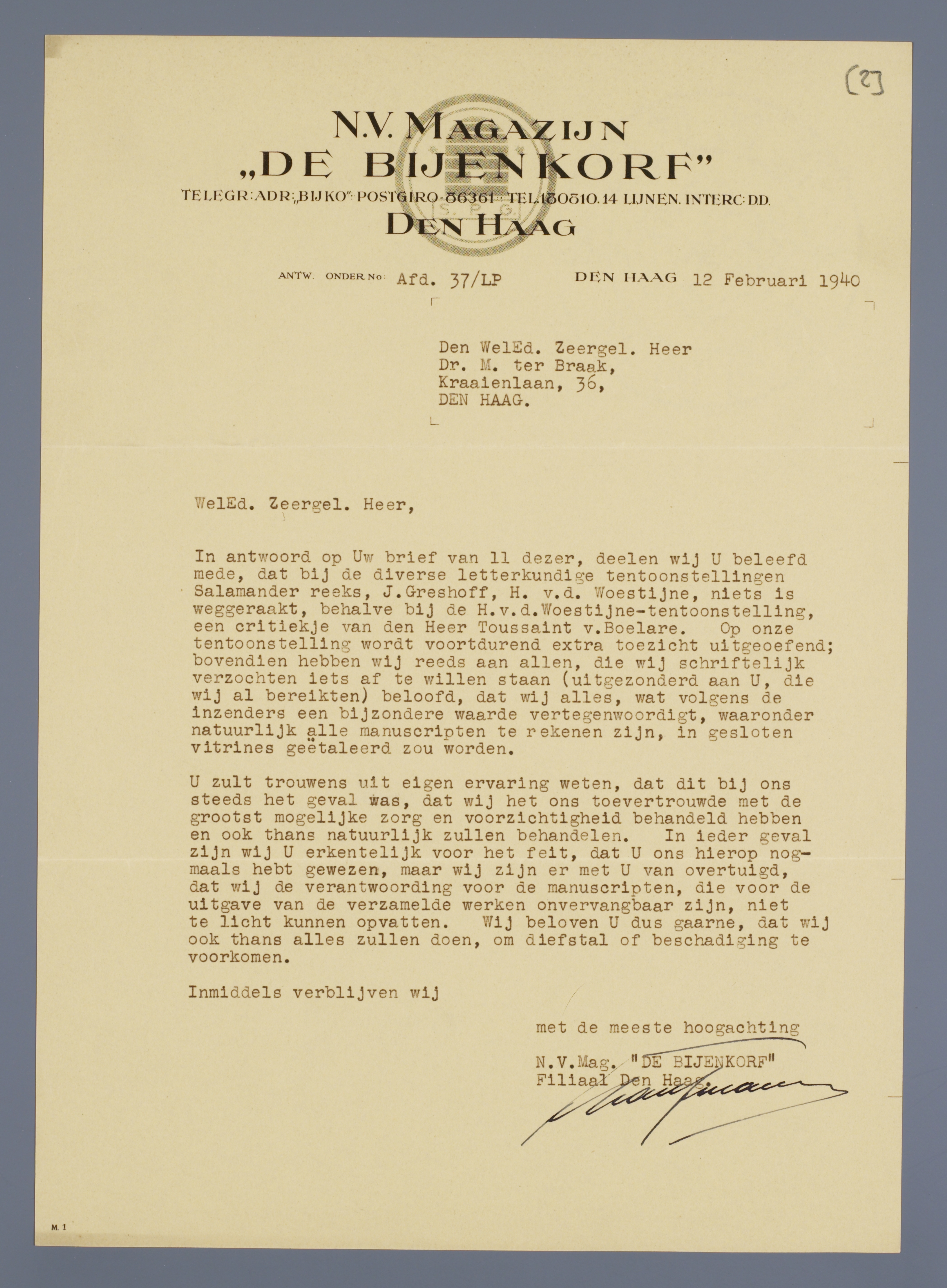 In antwoord op Uw brief van 11 dezer, deelen wij U beleefd mede, dat bij de diverse letterkundige tentoonstellingen Salamander reeks, J. Greshoff, H. v.d. Woestijne, niets is weggeraakt, behalve bij de H. v.d. Woestijne-tentoonstelling, een critiekje van den Heer Toussaint v. Boelare. Op onze tentoonstelling wordt voortdurend extra toezicht uitgeoefend; bovendien hebben wij reeds aan allen, die wij schriftelijk verzochten iets af te willen staan (uitgezonderd aan U, die wij reeds bereikten) beloofd, dat wij alles, wat volgens de inzenders een bijzondere waarde vertegenwoordigt, waaronder natuurlijk alle manuscripten te rekenen zijn, in gesloten vitrines geëtaleerd zou worden.