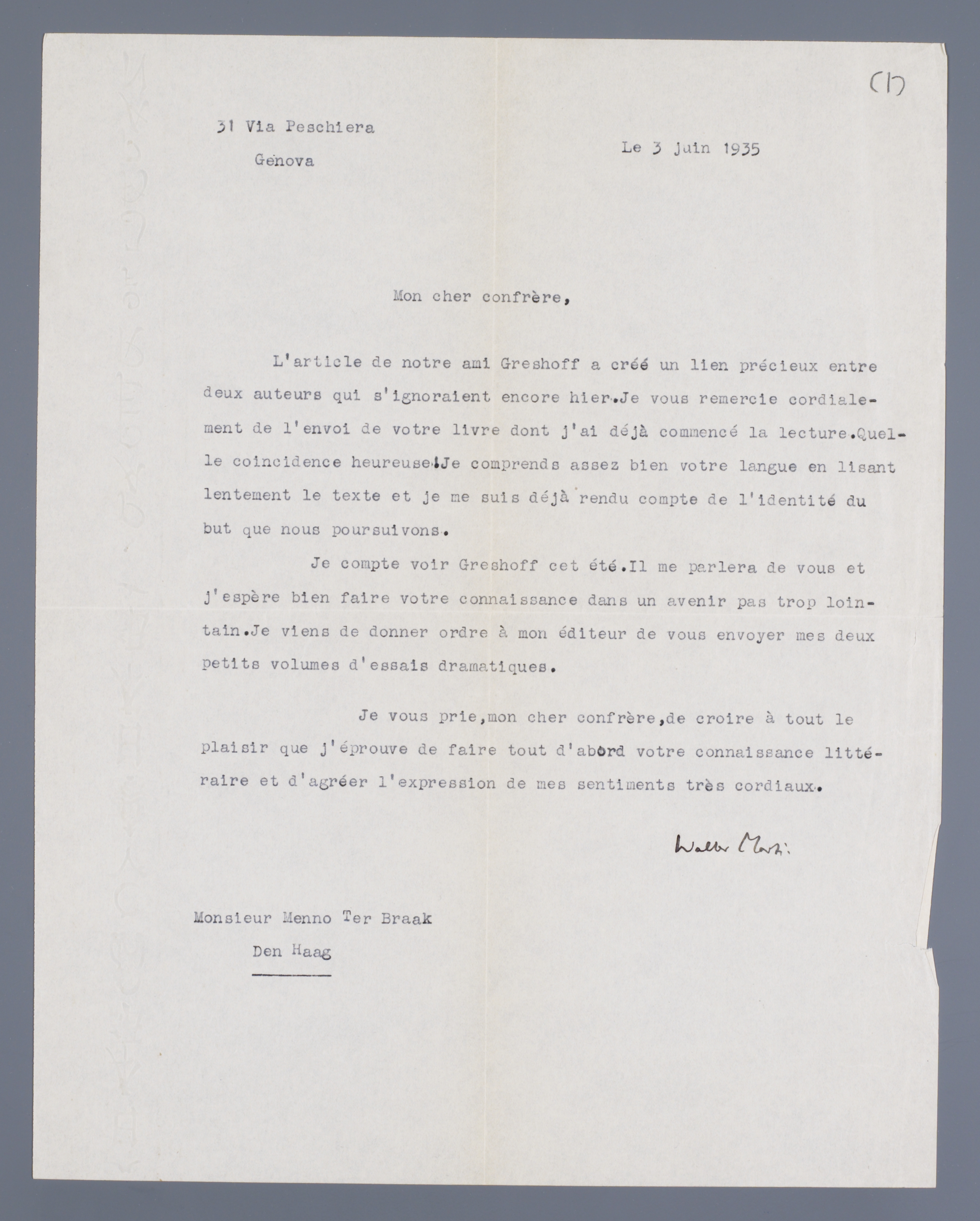 L'article de notre ami Greshoff a créé un lien précieux entre deux auteurs qui s'ignoraient encore hier. Je vous remercie cordialement de l'envoi de votre livre dont j'ai déjà commencé la lecture. Quelle coincidence heureuse! Je comprends assez bien votre langue en lisant lentement le texte et je me suis déjà rendu compte de l'identité du but que nous poursuivons.