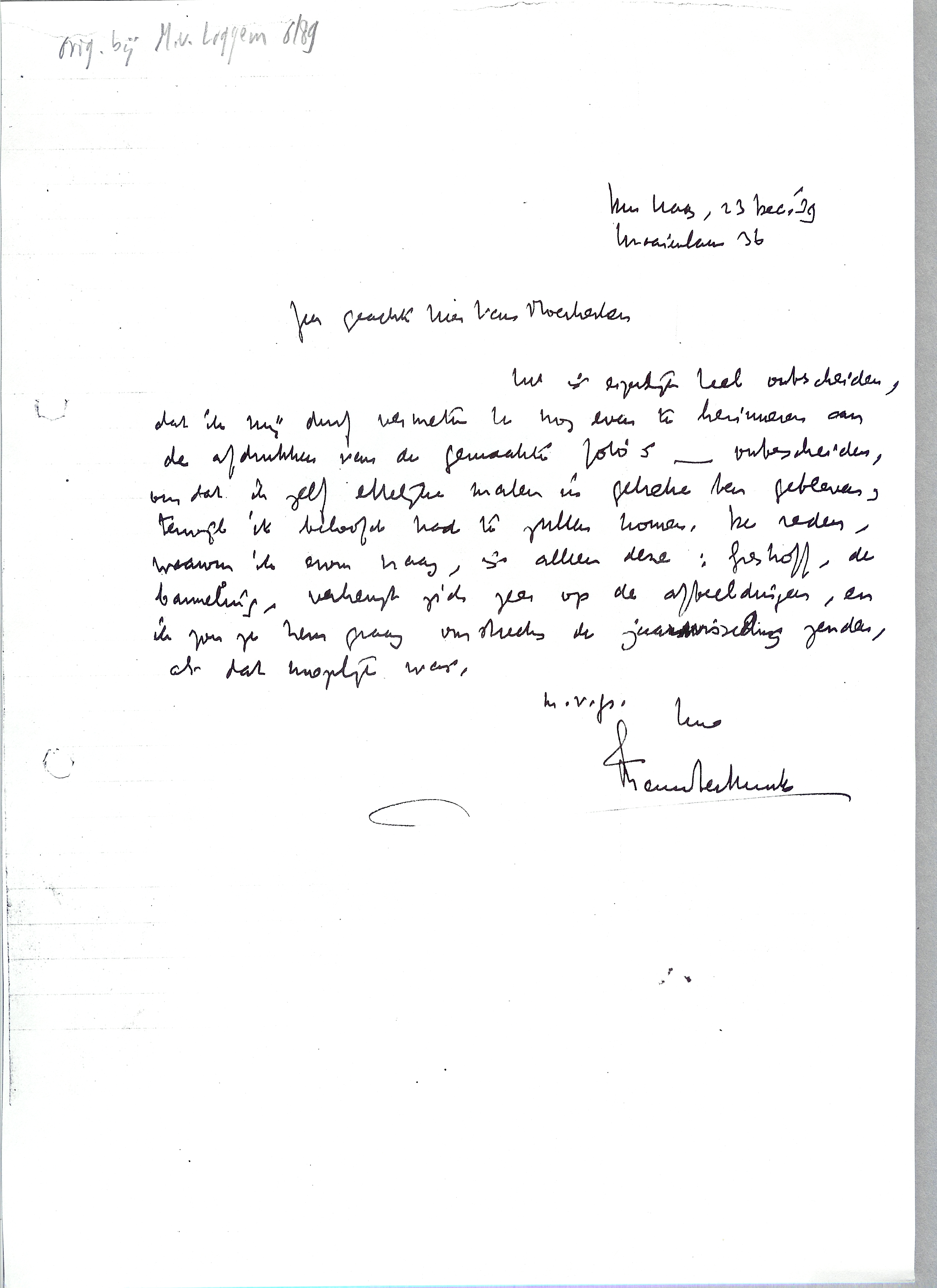 Het is eigenlijk heel onbescheiden, dat ik mij durf vermeten U nog even te herinneren aan de afdrukken van de gemaakte foto’s – onbescheiden omdat ik zelf ettelijke malen in gebreke ben gebleven, terwijl ik beloofd had te zullen komen. De reden, waarom ik erom vraag, is alleen deze: Greshoff, de banneling, verheugt zich zeer op de afbeeldingen, en ik zou ze hem graag omstreeks de jaarwisseling zenden, als dat mogelijk was.
