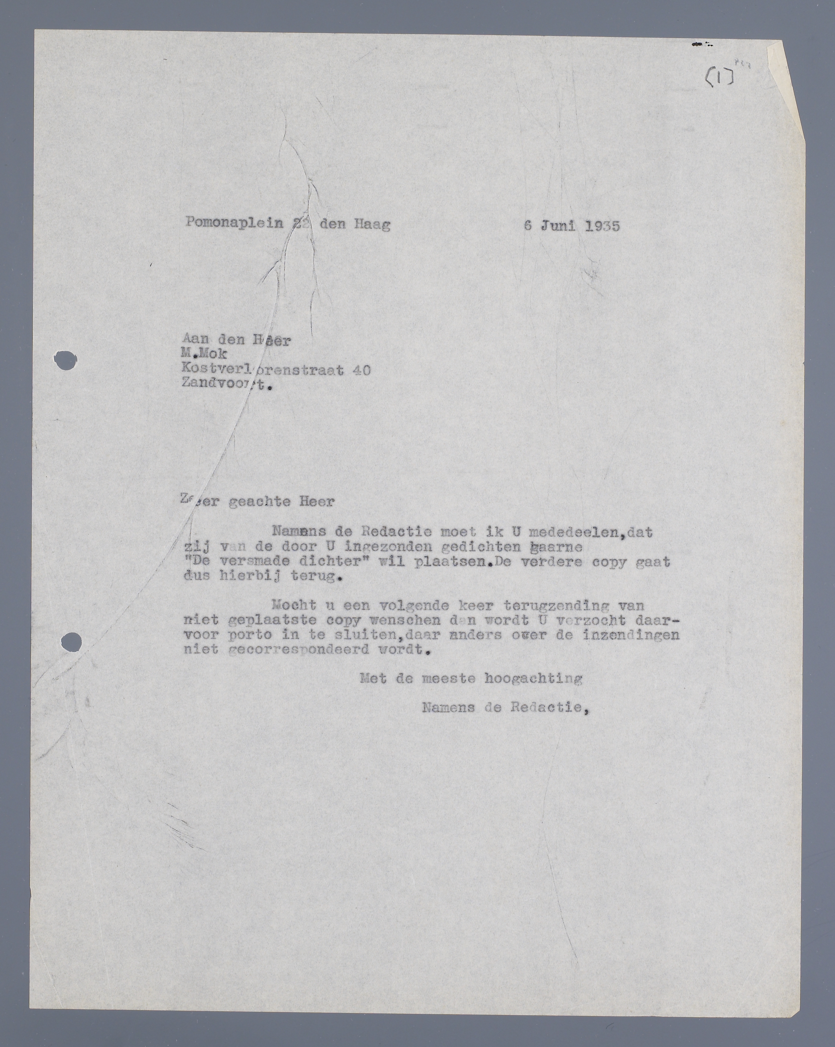 Namens de Redactie moet ik U mededeelen, dat zij van de door U ingezonden gedichten gaarne ‘De versmade dichter’ wil plaatsen. De verdere copy gaat dus hierbij terug.