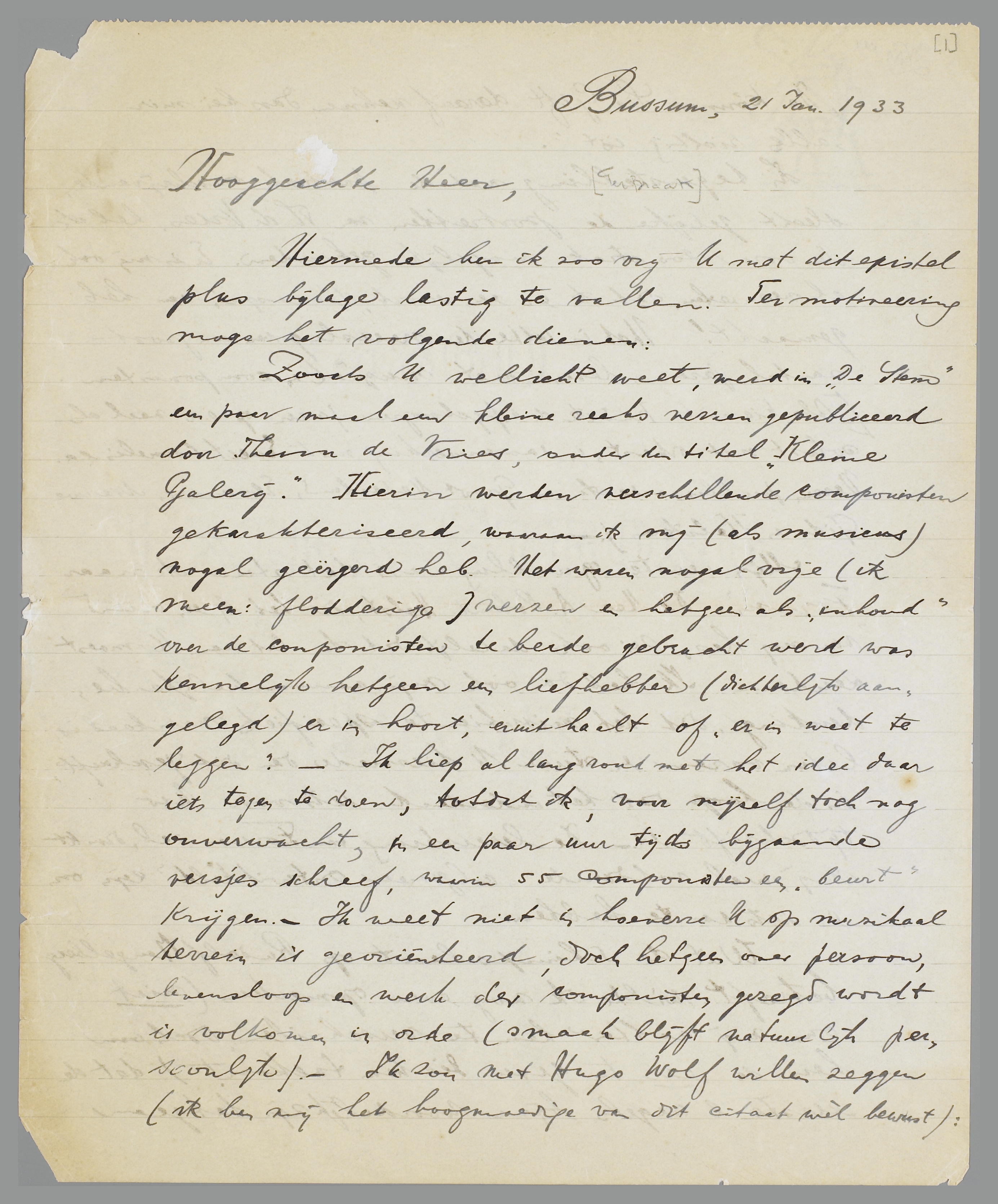 Zooals U wellicht weet, werd in ‘De Stem’ een paar maal een kleine reeks verzen gepubliceerd door Theun de Vries, onder den titel ‘Kleine Galerij’. Hierin werden verschillende componisten gekarakteriseerd, waaraan ik mij (als musicus) nogal geërgerd heb. Het waren nogal vrije (ik meen: flodderige) verzen en hetgeen als ‘inhoud’ over de componisten te berde gebracht werd was kennelijk hetgeen een liefhebber (dichterlijk aangelegd) erin hoort; eruit haalt of, erin weet te leggen: - Ik liep al lang rond met het idee daar iets tegen te doen, totdat ik, voor mijzelf toch nog onverwacht, in een paar uur tijds bijgaande versjes schreef, waarin 55 componisten een ‘beurt’ krijgen - Ik weet niet in hoeverre U op muzikaal terrein is georiënteerd; doch hetgeen over persoon, levensloop en werk der componisten gezegd wordt is volkomen in orde (smaak blijft natuurlijk persoonlijk) - Ik zou met Hugo Wolf willen zeggen (ik ben mij het hoogmoedige van dit citaat wèl bewust): ‘Da können Sie Gift darauf nehmen, dass bei mir alles richtig ist’.