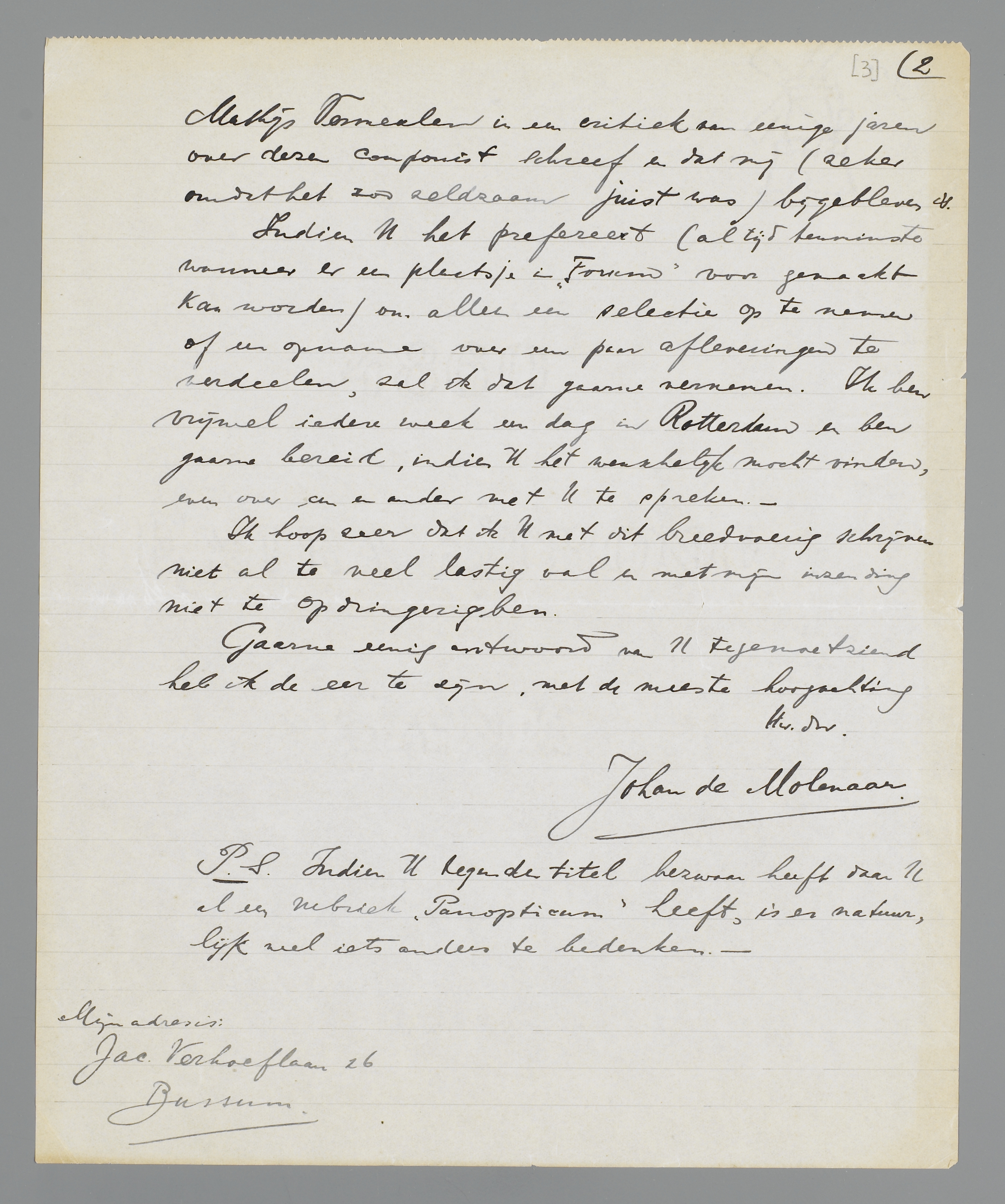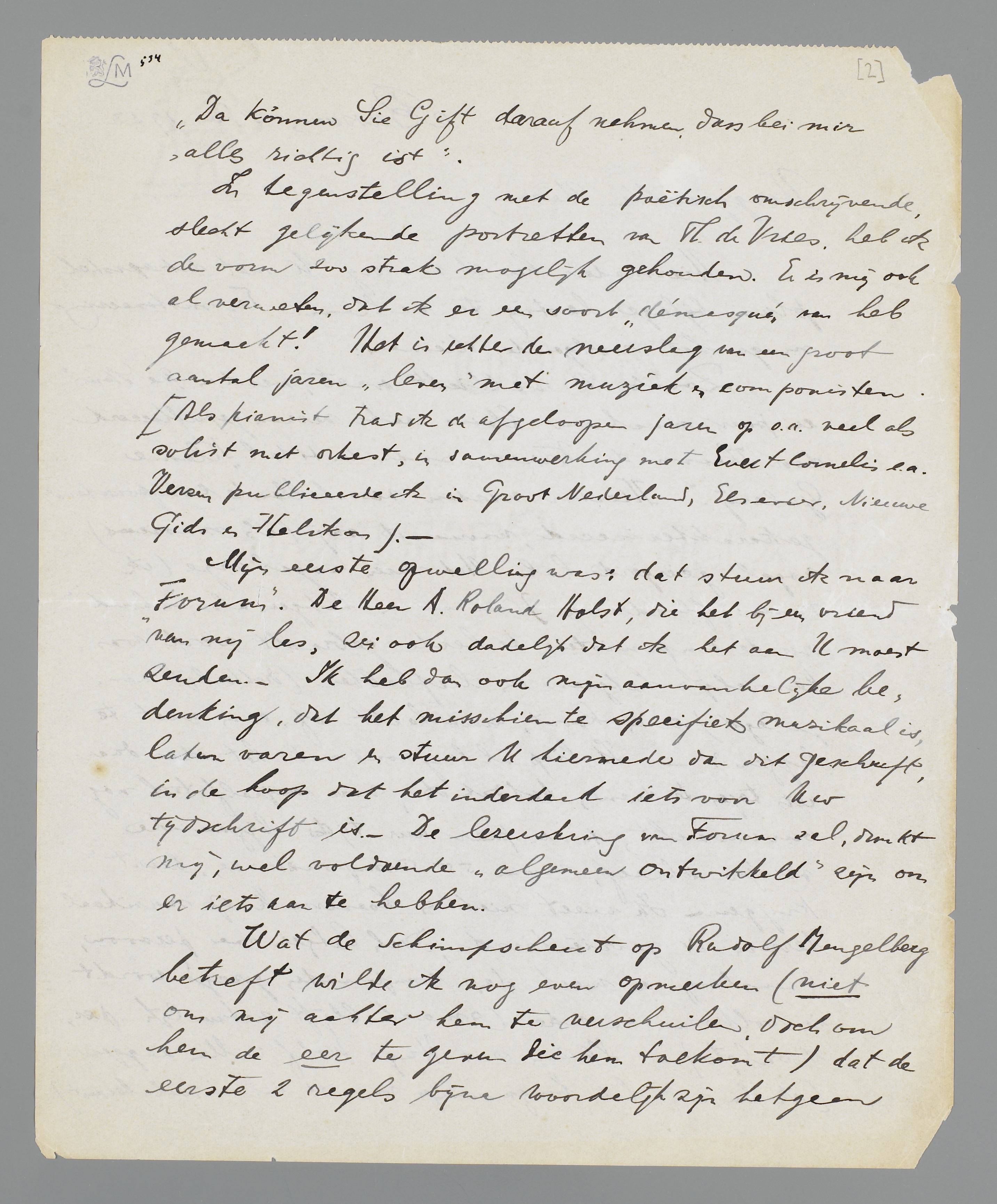 Mijn eerste opwelling was: dat stuur ik naar ‘Forum’. De Heer A. Roland Holst, die het bij een vriend van mij las, zei ook dadelijk dat ik het aan U moest zenden. Ik heb dan ook mijn aanvankelijke bedenking dat het misschien te specifiek muzikaal is, laten varen en stuur U hiermede dan dit geschrift, in de hoop dat het inderdaad iets voor Uw tijdschrift is. De lezerskring van Forum zal, dunkt mij, wel voldoende ‘algemeen ontwikkeld’ zijn om er iets aan te hebben.