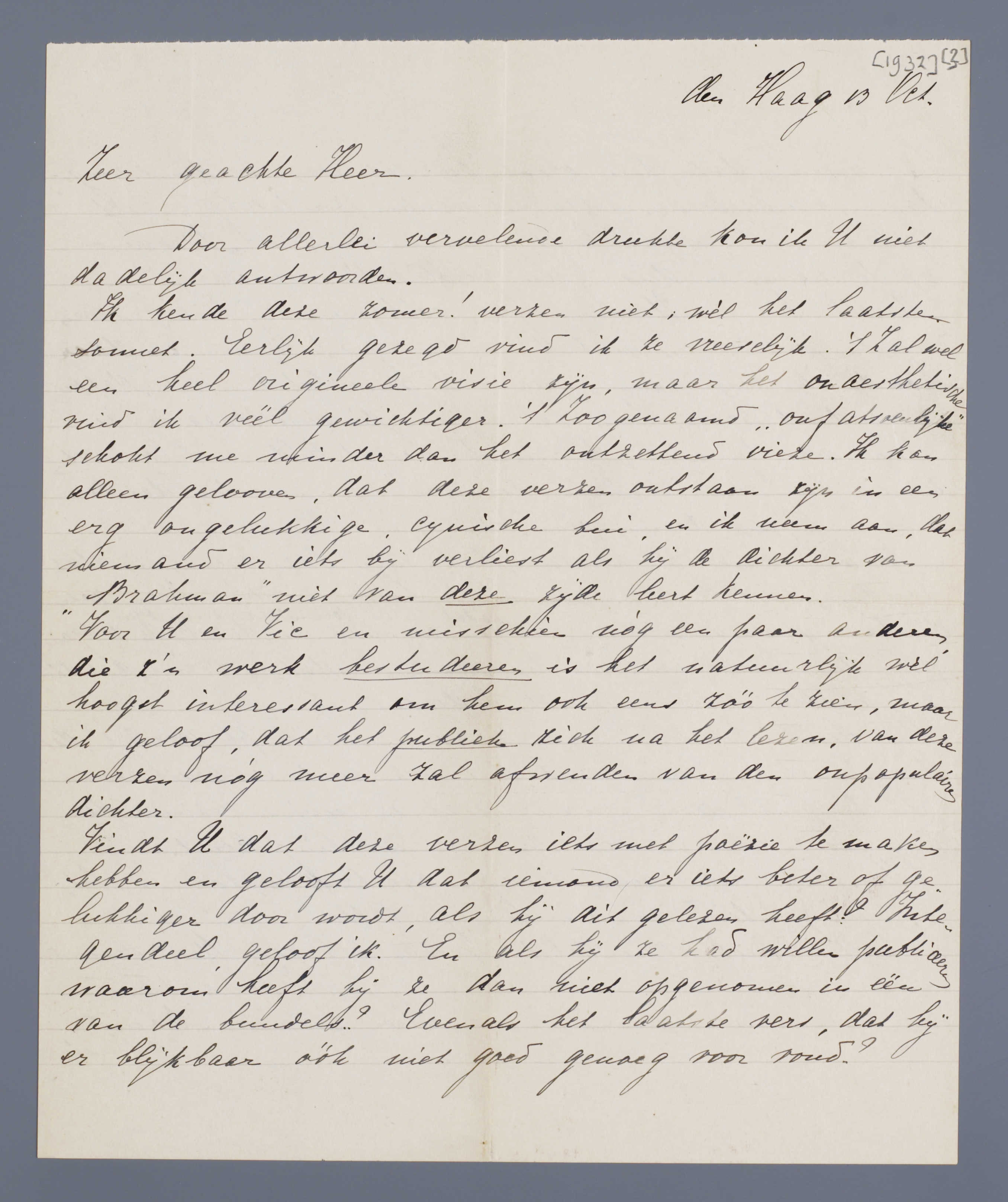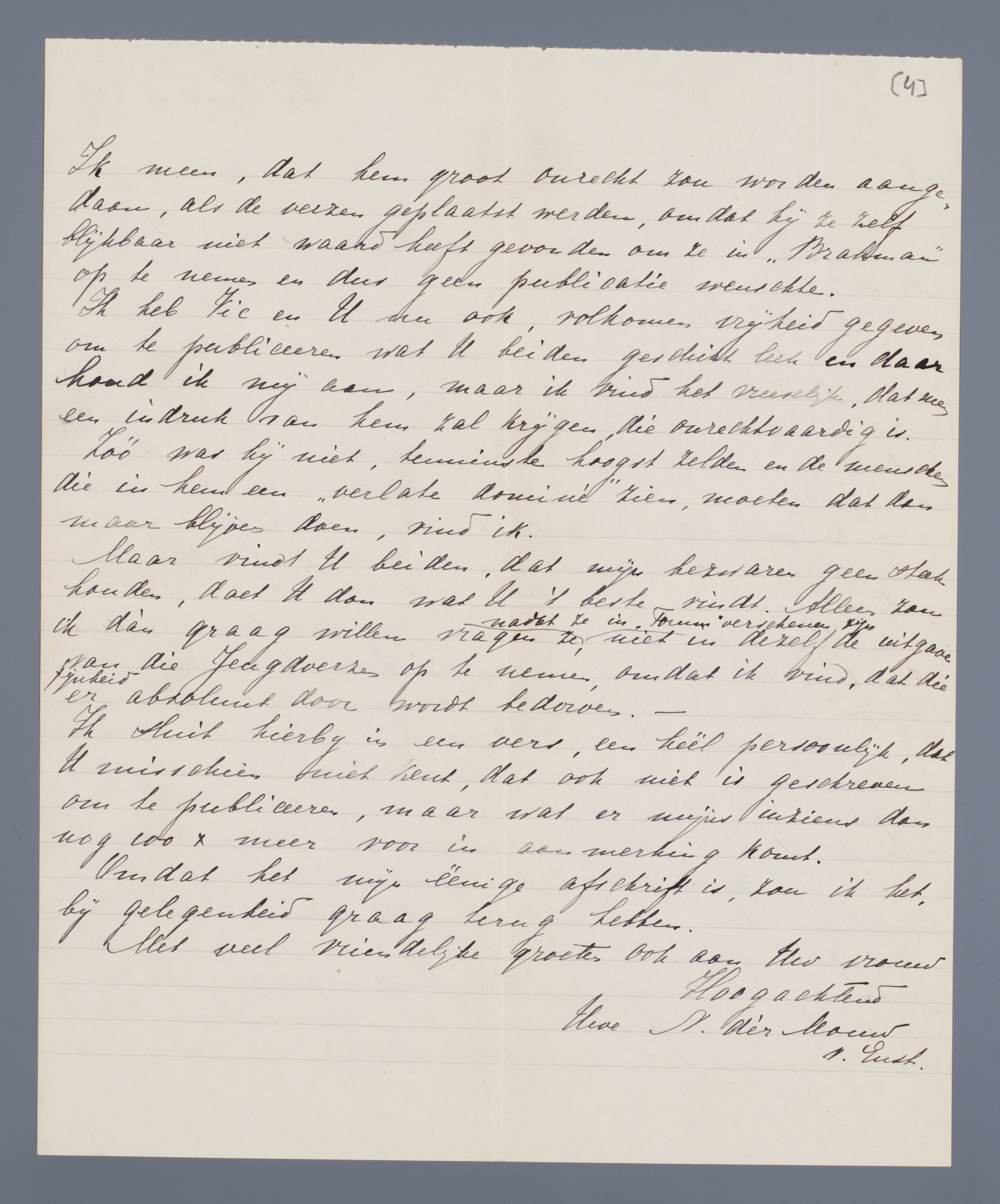 Ik meen, dat hem groot onrecht zou worden aangedaan, als de verzen geplaatst werden, omdat hij ze zelf blijkbaar niet waard heeft gevonden om ze in ‘Brahman’ op te nemen en dus geen publicatie wenschte.