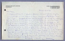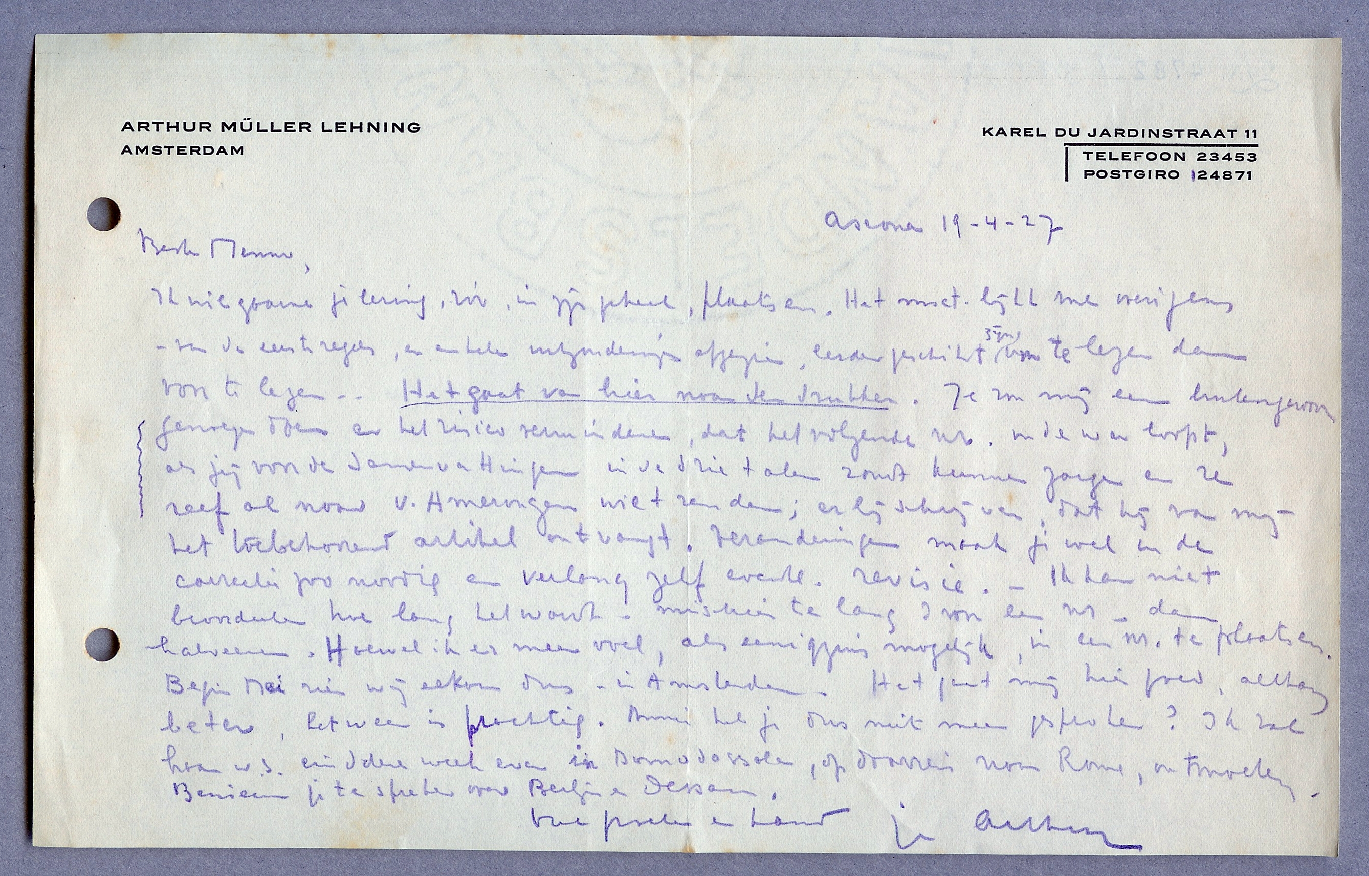 Ik wil gaarne je lezing, zóo, in zijn geheel, plaatsen. Het moet - lijkt me overigens - van de eerste regels, en enkele uitzonderingen afgezien, eerder geschikt zijn om te lezen dan voor te lezen... Het gaat van hier naar den drukker. Je zou mij een buitengewoon genoegen doen en het risico verminderen, dat het volgende nr. in de war loopt, als jij voor de samenvattingen in de drie talen zoudt kunnen zorgen en ze zelf al naar v. Amerongen wilt zenden; er bij schrijven, dat hij van mij het toebehoorend artikel ontvangt. Veranderingen maak je wel in de correctie zoo noodig en verlang zelf eventl. revisie. - Ik kan niet beoordeelen hoe lang het wordt, misschien te lang? voor een nr. dan halveeren. Hoewel ik er meer voor voel, als eenigszins mogelijk, in een nr. te plaatsen. Begin Mei zien wij elkaar dus - in Amsterdam. Het gaat mij hier goed, althans beter, het weer is prachtig. Annie heb je dus niet meer gesproken? Ik zal haar w.s. eind deze week even in Domodossola, op doorreis naar Rome, ontmoeten. Benieuwd je te spreken over Berlijn en Dessau.