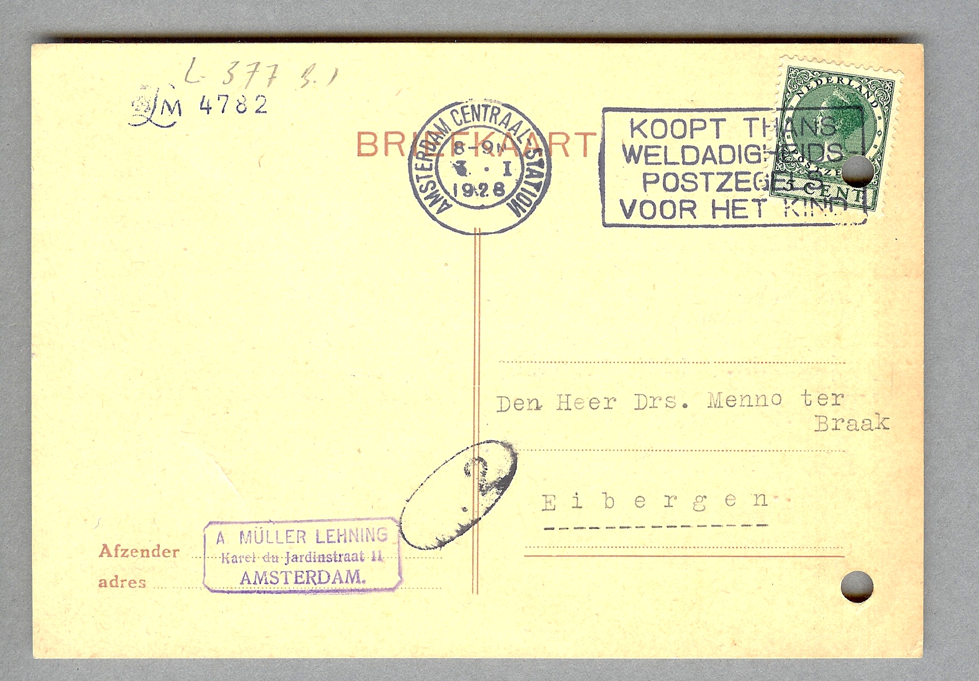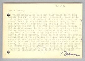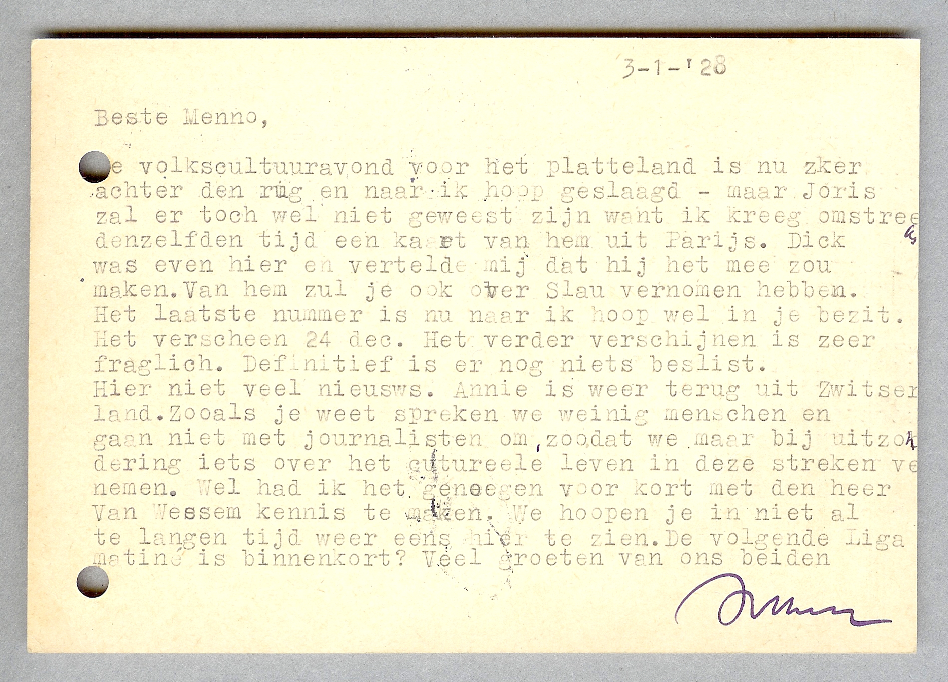 Hier niet veel nieuws. Annie is weer terug uit Zwitserland. Zooals je weet spreken we weinig menschen en gaan niet met journalisten om, zoodat we maar bij uitzondering iets over het cultureele leven in deze streken vernemen. Wel had ik het genoegen voor kort met den heer Van Wessem kennis te maken. We hoopen je in niet al te langen tijd weer eens hier te zien. De volgende Liga matiné is binnenkort?