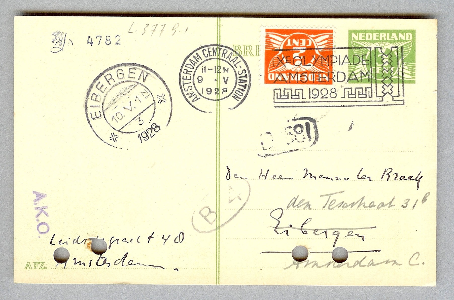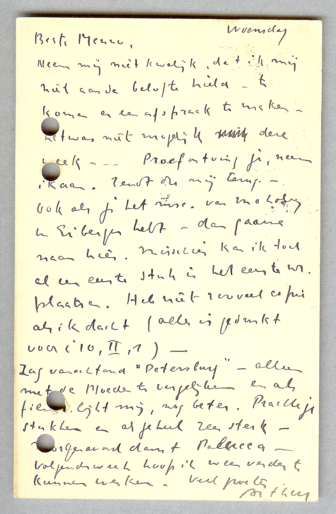 Neem mij niet kwalijk, dat ik mij niet aan de belofte hield - te komen en een afspraak te maken - het was niet mogelijk deze week... Proef ontving je, neem ik aan. Zendt ze mij terug - ook als je het msc. van Moholy in Eibergen hebt - dan gaarne naar hier. Misschien kan ik toch al een eerste stuk in het eerste nr. plaatsen. Heb niet zoo veel copie als ik dacht (alles is gedrukt voor i10, II, 1) -
