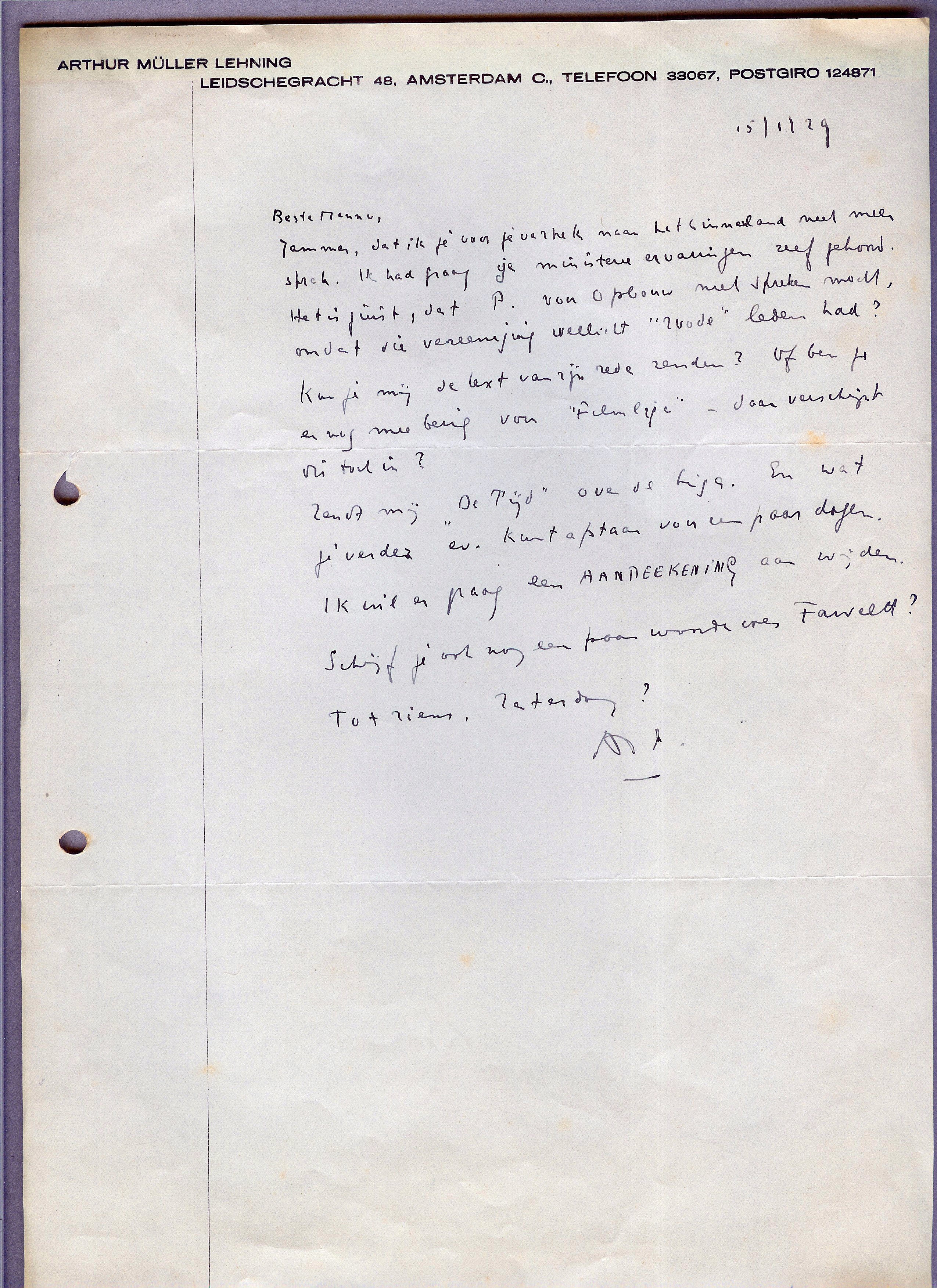 Jammer, dat ik je voor je vertrek naar het binnenland niet meer sprak. Ik had graag je ministerie ervaringen zelf gehoord. Het is juist, dat P. van Opbouw niet spreken mocht, omdat die vereeniging wellicht ‘roode’ leden had? Kun je mij de text van zijn rede zenden? Of ben je er nog mee bezig voor ‘Filmliga’ - daar verschijnt die toch in?