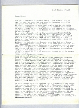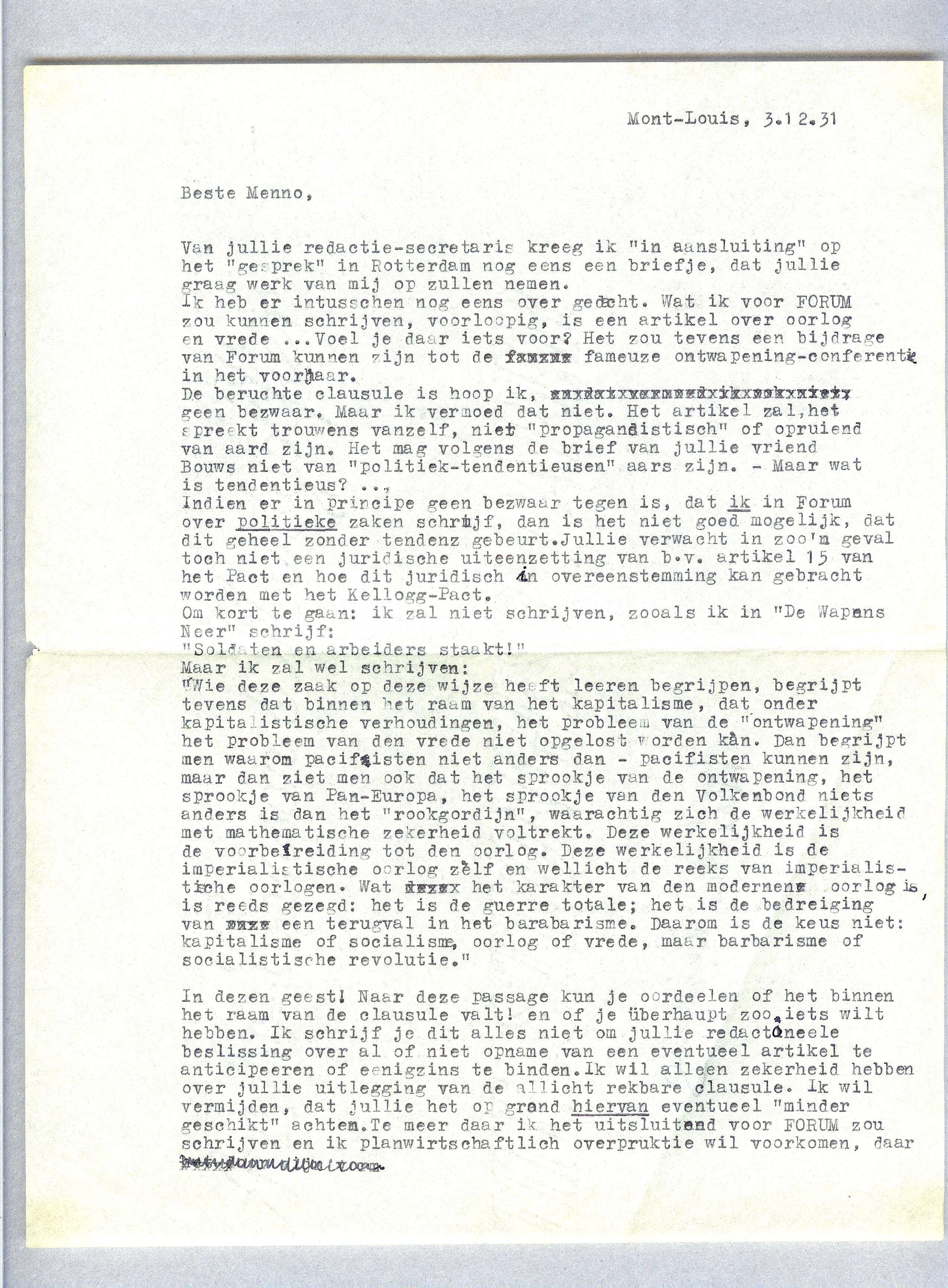 Ik heb er intusschen nog eens over gedacht. Wat ik voor FORUM zou kunnen schrijven, voorloopig, is een artikel over oorlog en vrede... Voel je daar iets voor? Het zou tevens een bijdrage van Forum kunnen zijn tot de fameuze ontwapening-conferentie in het voorjaar.