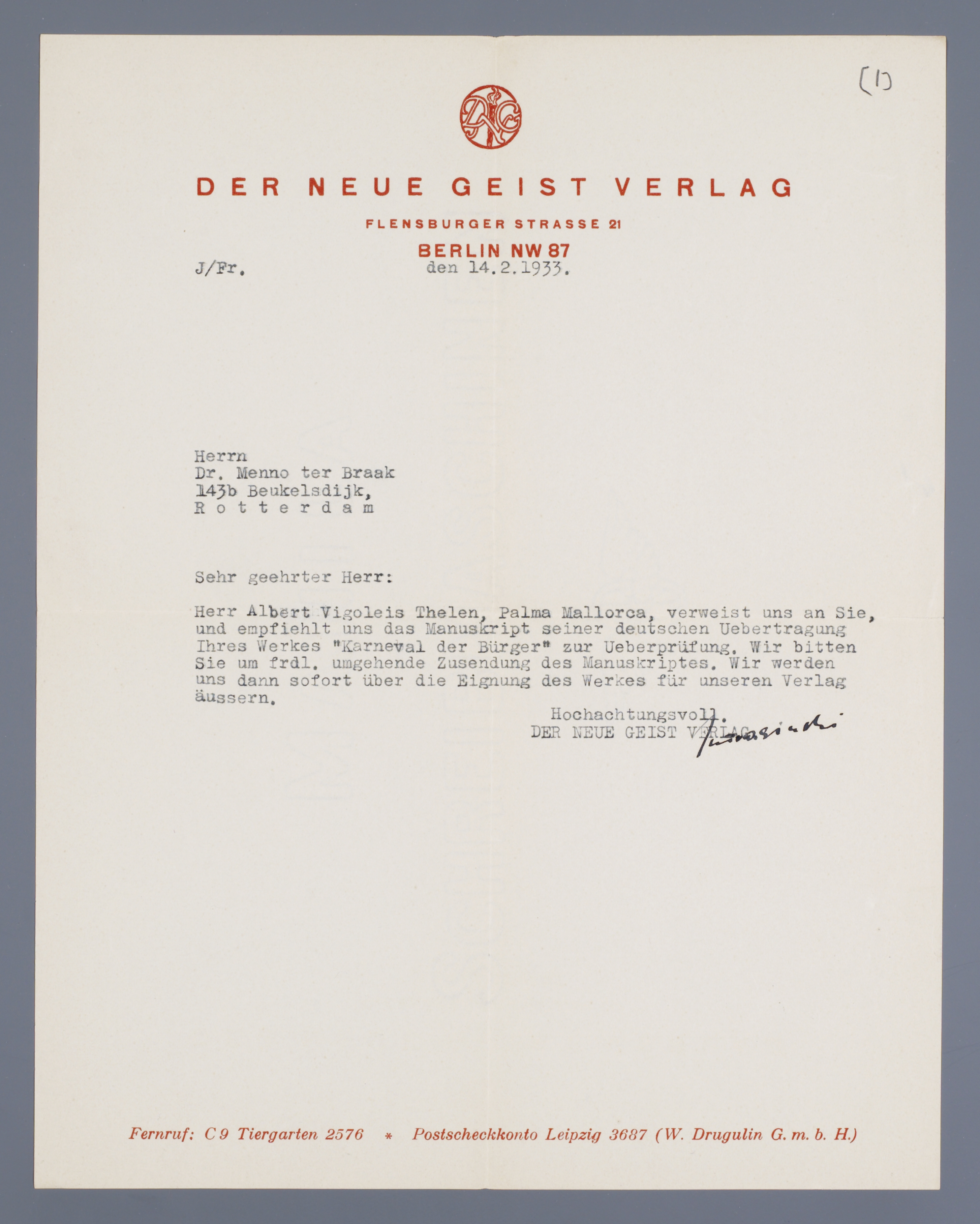 Herr Albert Vigoleis Thelen, Palma Mallorca, verweist uns an Sie, und empfiehlt uns das Manuskript seiner deutschen Uebertragung Ihres Werkes ‘Karneval der Bürger’ zur Ueberprüfung. Wir bitten Sie um frdl. umgehende Zusendung des Manuskriptes. Wir werden uns dann sofort über die Eignung des Werkes für unseren Verlag äussern.