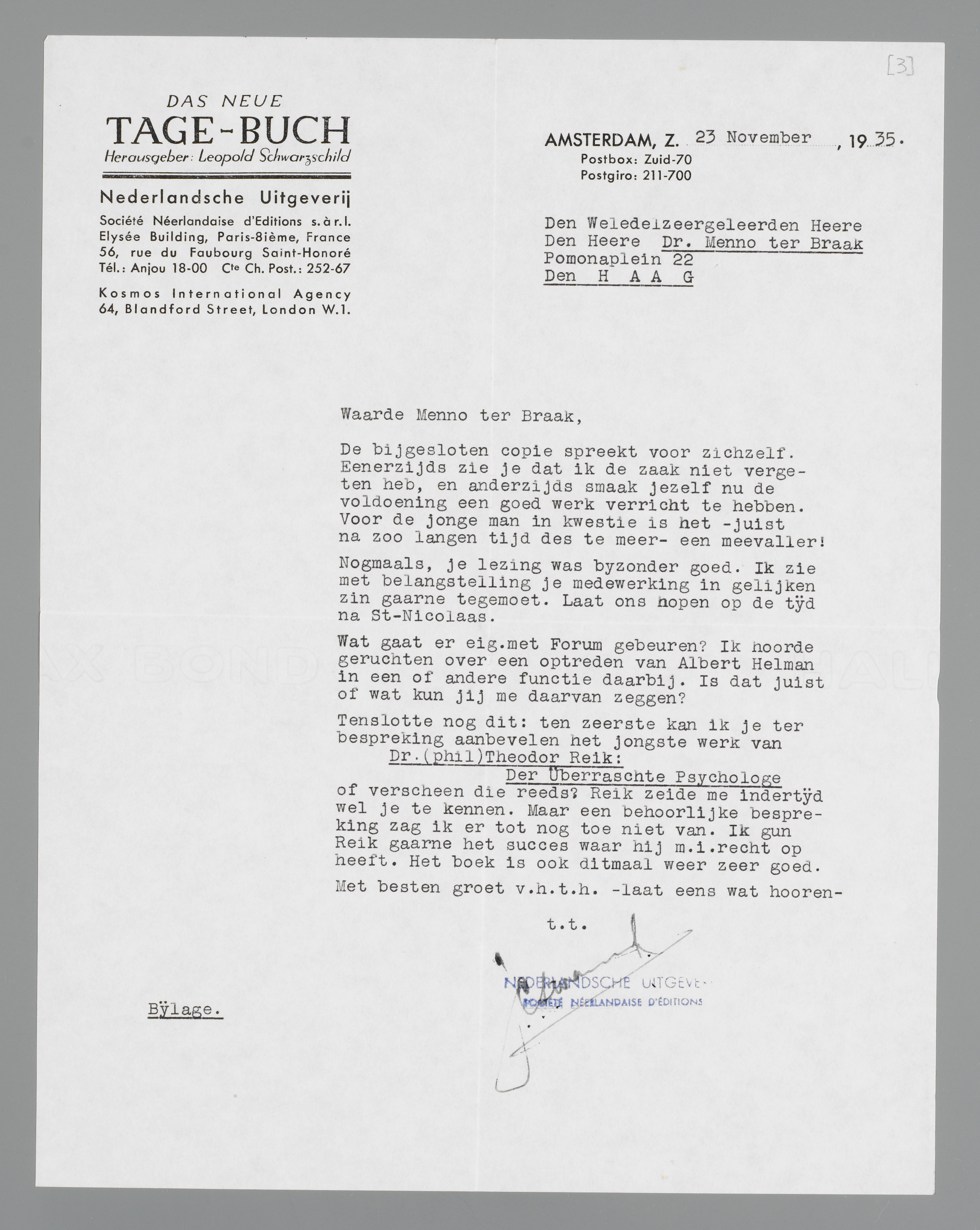 Tenslotte nog dit: ten zeerste kan ik je ter bespreking aanbevelen het jongste werk van Dr. (phil) Theodor Reik: Der Ueberraschte Psychologe of verscheen die reeds? Reik zeide me indertÿd wel je te kennen. Maar een behoorlijke besprekeing zag ik er tot nog toe niet van. Ik gun Reik gaarne het succes waar hij m.i. recht op heeft. Het boek is ook ditmaal weer zeer goed.