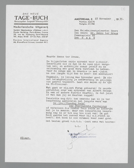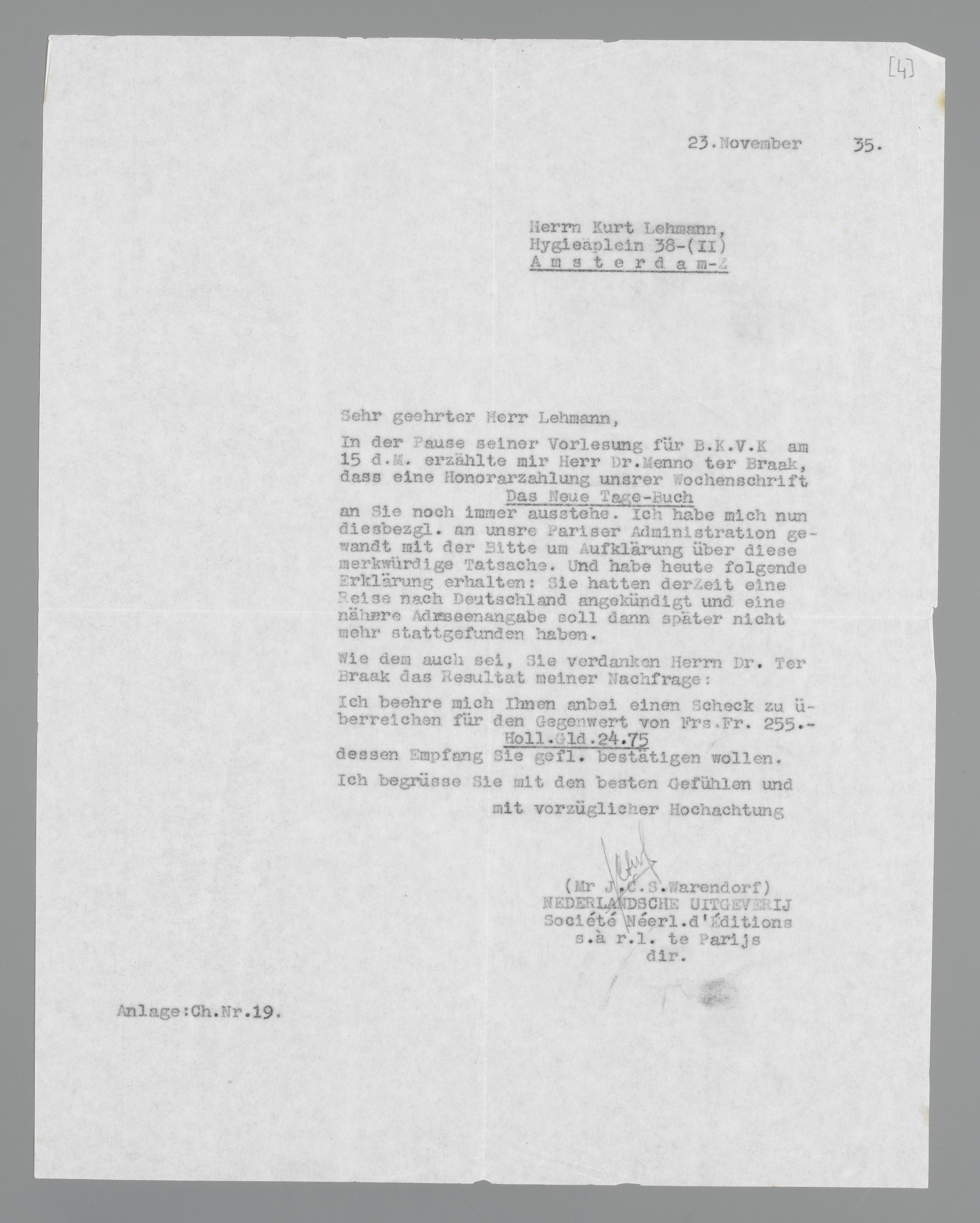 In der Pause seiner Vorlesung für B.K.V.K. am 15 d.M. erzählte mir Herr Dr. Menno ter Braak, dass eine Honorarzahlung unsrer Wochenschrift