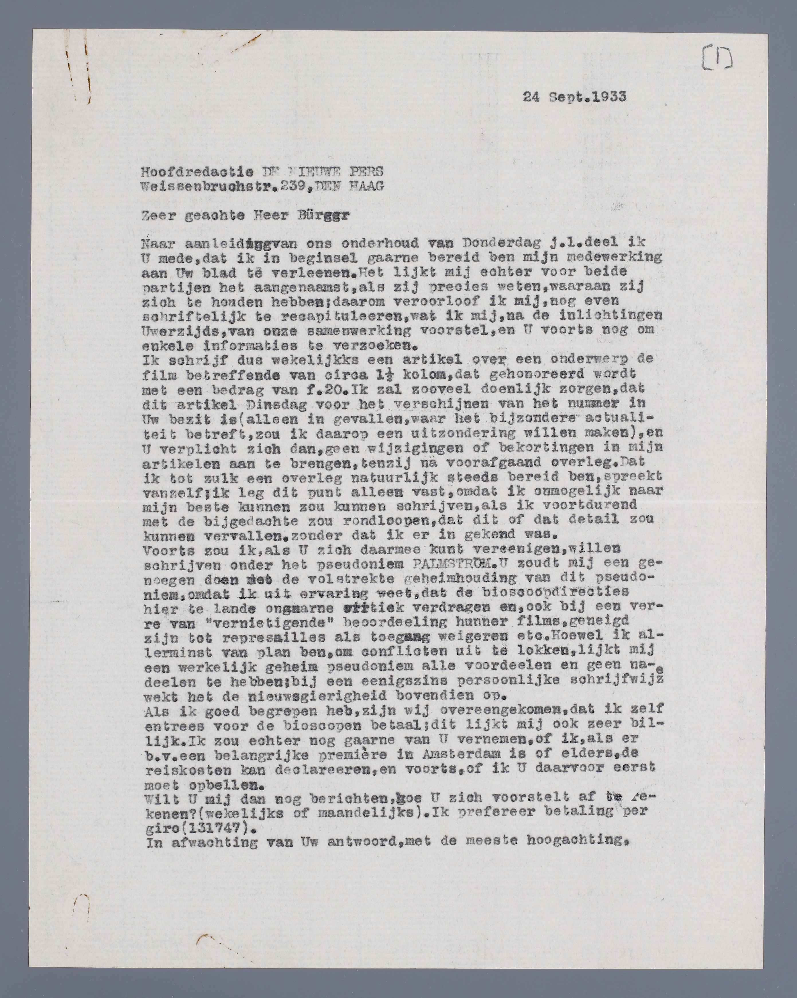 Voorts zou ik, als U zich daarmee kunt vereenigen, willen schrijven onder het pseudoniem PALMSTRöM. U zoudt mij een genoegen doen met de volstrekte geheimhouding van dit pseudoniem, omdat ik uit eenige ervaring weet, dat de bioscoopdirecties hier te lande ongaarne critiek verdragen en, ook bij een verre van ‘vernietigende’ beoordeling hunner films, geneigd zijn tot represailles als toegang weigeren etc. Hoewel ik allerminst van plan ben conflicten uit te lokken, lijkt mij een werkelijk geheim pseudoniem alle voordeelen en geen nadeelen te hebben; bij een eenigzins persoonlijke schrijfwijze wekt het de nieuwsgierigheid bovendien op.
