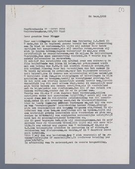 Ik schrijf dus wekelijks een artikel over een onderwerp de film betreffende van circa 1½ kolom, dat gehonoreerd wordt met een bedrag van f.20. Ik zal zooveel doenlijk zorgen, dat dit artikel Dinsdag voor het verschijnen van het nummer in Uw bezit is (alleen in gevallen, waar het bijzondere actualiteit betreft, zou ik daarop een uitzondering willen maken), en U verplicht zich dan, geen wijzigingen of bekortingen in mijn artikelen aan te brengen, tenzij na voorafgaand overleg. Dat ik tot zulk een overleg natuurlijk steeds gaarne bereid ben, spreekt vanzelf; ik leg dit punt alleen vast, omdat ik onmogelijk naar mijn beste kunnen zou kunnen schrijven, als ik voortdurend met de bijgedachte zou rondloopen, dat dit of dat detail zou kunnen vervallen, zonder dat ik er in gekend was.