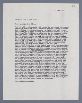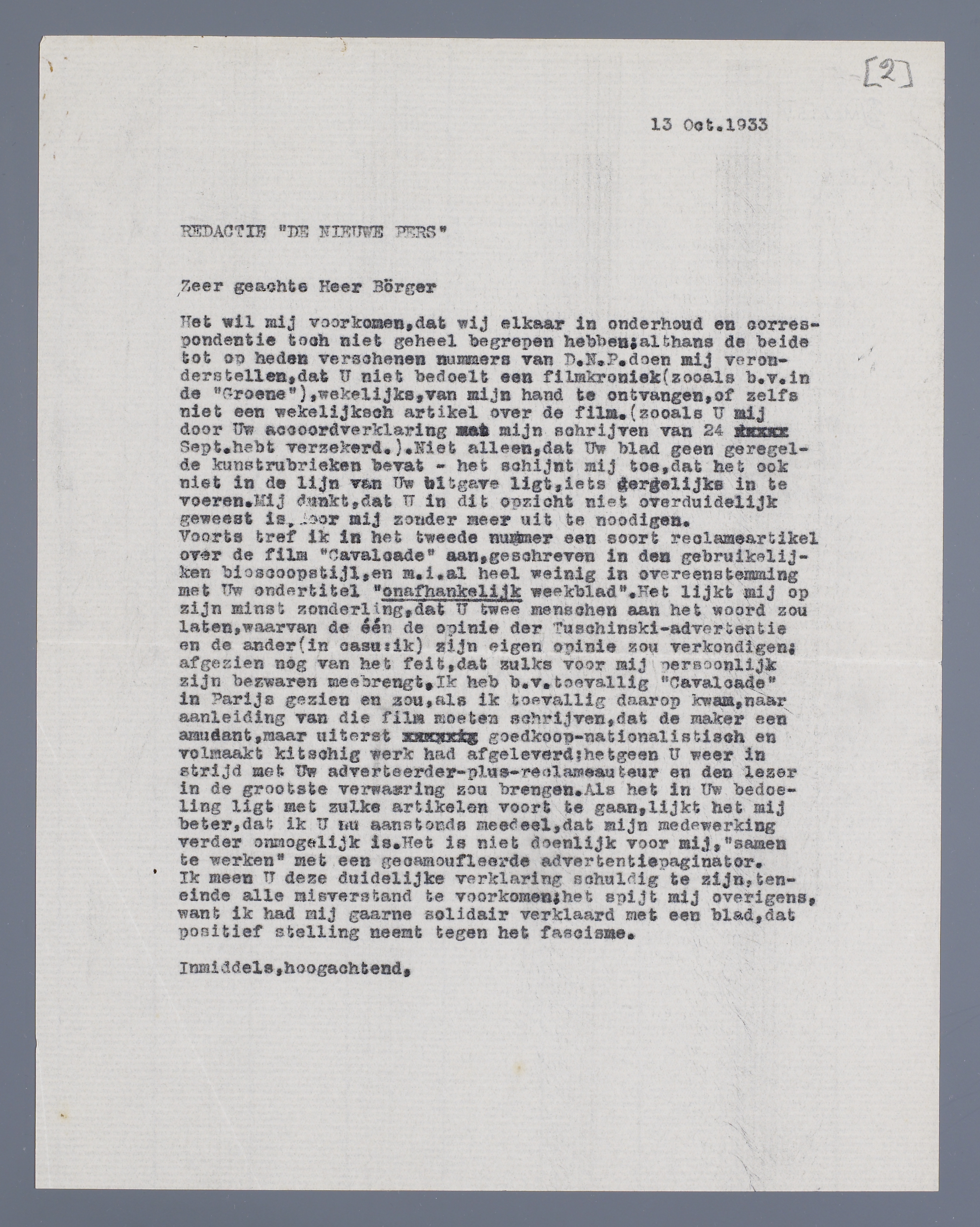 Voorts tref ik in het tweede nummer een soort reclameartikel over de film ‘Cavalcade’ aan, geschreven in den gebruikelijken bioscoopstijl, en m.i. al heel weinig in overeenstemming met Uw ondertitel ‘onafhankelijk weekblad’. Het lijkt mij op zijn minst zonderling, dat U twee menschen aan het woord zou laten, waarvan de één de opinie der Tuschinski-advertentie en de ander (in casu: ik) zijn eigen opinie zou verkondigen: afgezien nog van het feit, dat zulks voor mij persoonlijk zijn bezwaren meebrengt. Ik heb b.v. toevallig ‘Calvalcade’ in Parijs gezien en zou, als ik toevallig daarop kwam, naar aanleiding van die film moeten schrijven, dat de maker een amusant, maar uiterst goedkoop-nationalistisch en volmaakt kitschig werk had afgeleverd; hetgeen U weer in strijd met Uw adverteerder-plus-reclameauteur en den lezer in de grootste verwarring zou brengen. Als het in Uw bedoeling ligt met zulke artikelen voort te gaan, lijkt het mij beter, dat ik U nu aanstonds meedeel, dat mijn medewerking verder onmogelijk is. Het is niet doenlijk voor mij, ‘samen te werken’ met een gecamoufleerde advertentiepaginator.