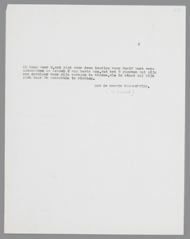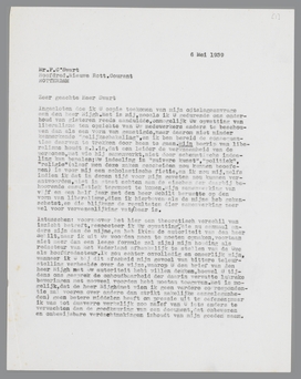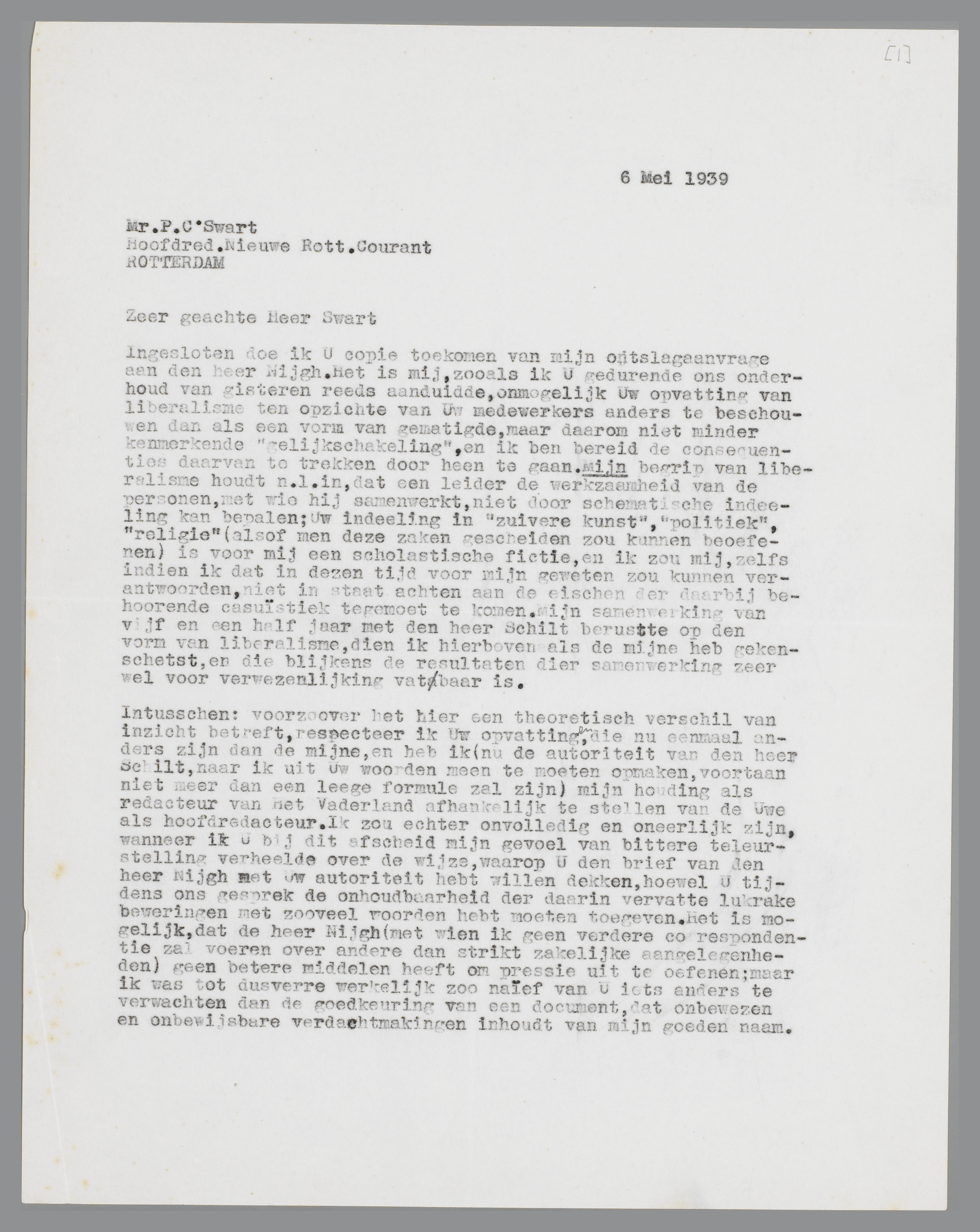 Ingesloten doe ik U copie toekomen van mijn ontslagaanvrage aan den heer Nijgh. Het is mij, zooals ik U gedurende ons onderhoud van gisteren reeds aanduidde, onmogelijk Uw opvatting van liberalisme ten opzichte van Uw medewerkers anders te beschouwen dan als een vorm van gematigde, maar daarom niet minder kenmerkende ‘gelijkschakeling’, en ik ben bereid de consequenties daarvan te trekken door heen te gaan. Mijn begrip van liberalisme houdt n.l. in, dat een leider de werkzaamheid van de personen, met wie hij samenwerkt, niet door schematische indeeling kan bepalen; Uw indeeling in ‘zuivere kunst’, ‘politiek’, ‘religie’ (alsof men deze zaken gescheiden zou kunnen beoefenen) is voor mij een scholastische fictie, en ik zou mij, zelfs indien ik dat in dezen tijd voor mijn geweten zou kunnen verantwoorden, niet in staat achten aan de eischen der daarbij behoorende casuïstiek tegemoet te komen. Mijn samenwerking van vijf en een half jaar met den heer Schilt berustte op den vorm van liberalisme, dien ik hierboven als de mijne heb gekenschetst, en die blijkens de resultaten dier samenwerking zeer wel voor verwezenlijking vatbaar is.
