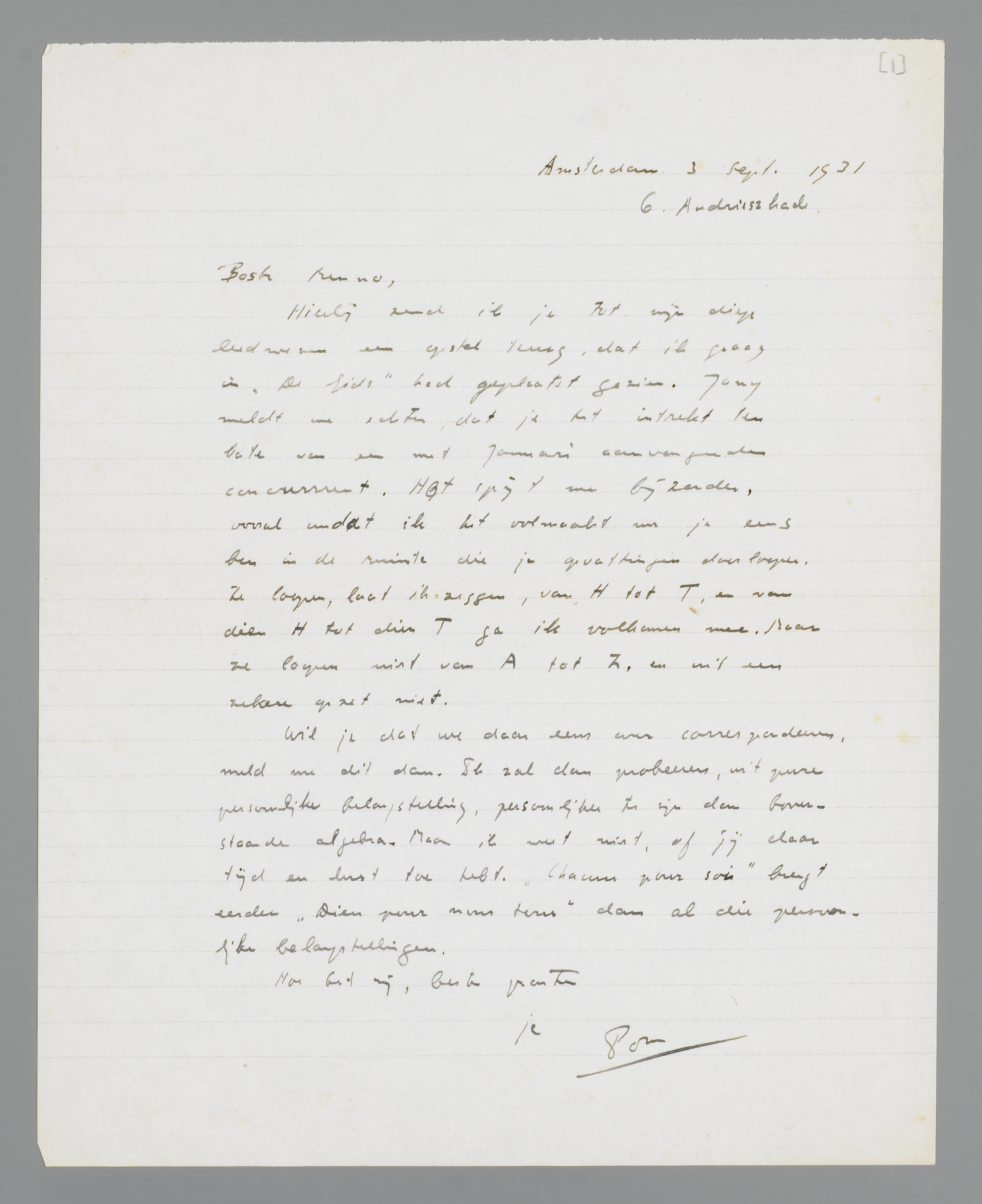 Hierbij zend ik je tot mijn diepe leedwezen een opstel terug, dat ik graag in ‘De Gids’ had geplaatst gezien. Jany meldt me echter, dat je het intrekt ten bate van een met Januari aanvangenden concurrent. Het spijt me bijzonder, vooral omdat ik het volmaakt [met] je eens ben in de ruimte die je opvattingen doorloopen. Ze loopen, laat ik zeggen, van H tot T en van dien H tot dien T ga ik volkomen mee. Maar ze loopen niet van A tot Z, en uit een zekere opzet niet.