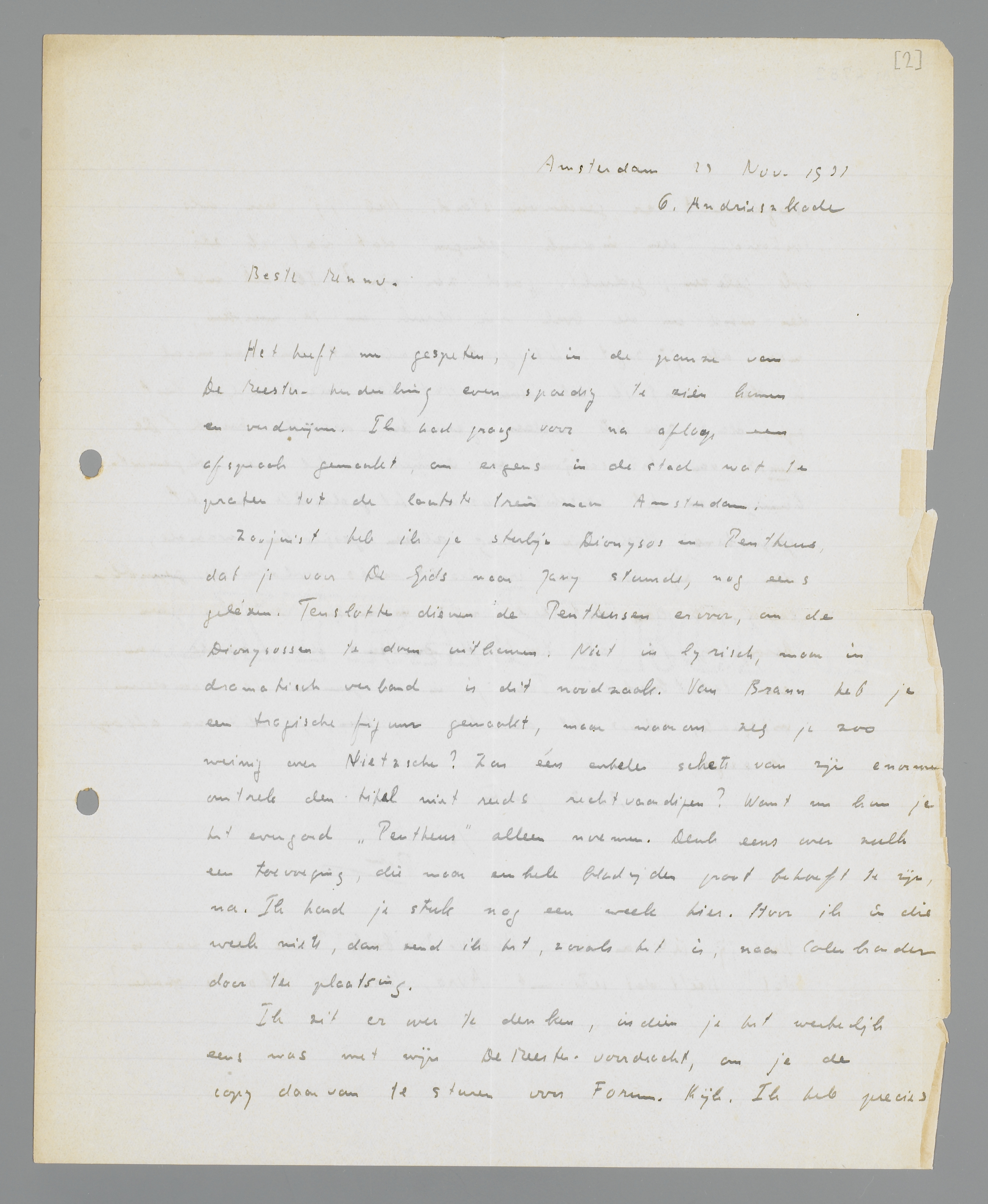Zoojuist heb ik je stukje Dionysos en Pentheus, dat je voor De Gids naar Jany stuurde, nog eens gelezen. Tenslotte dienen de Pentheussen ervoor, om de Dionysossen te doen uitkomen. Niet in Lyrisch, maar in dramatisch verband - is dit noodzaak. Van Brann heb je een tragische figuur gemaakt, maar waarom zeg je zoo weinig over Nietzsche? Zou één enkele schets van zijn enorme omtrek den titel niet reeds rechtvaardigen? Want nu kun je het evengoed ‘Pentheus’ alleen noemen. Denk eens over zulk een toevoeging, die maar enkele bladzijden groot hoeft te zijn, na. Ik houd je stuk nog een week hier. Hoor ik in die week niets, dan zend ik het, zooals het is, naar Colenbrander door ter plaatsing.