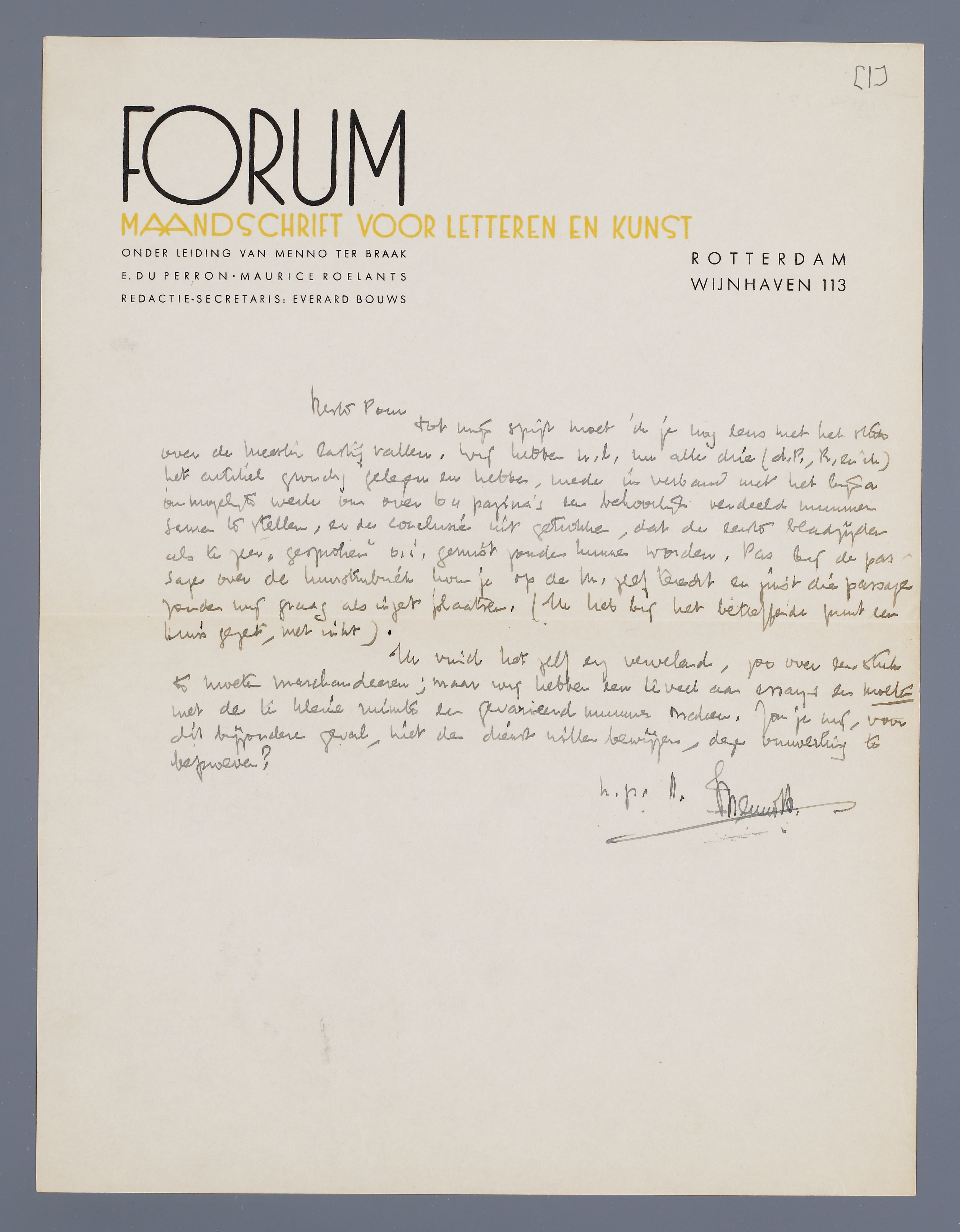 tot mijn spijt moet ik je nog eens met het stuk over de Meester lastig vallen. Wij hebben n.l. nu alle drie (d.P., R. en ik) het artikel grondig gelezen en hebben, mede in verband met het bijna onmogelijke werk om over 64 pagina's een behoorlijk verdeeld nummer samen te stellen, er de conclusie uit getrokken, dat de eerste bladzijden als te zeer ‘gesproken’ o.i. gemist zouden kunnen worden. Pas bij de passage over de kunstrubriek kom je op de M. zelf terecht en juist die passage zouden wij graag als inzet plaatsen. (Ik heb bij het betreffende punt een kruis gezet, met inkt).