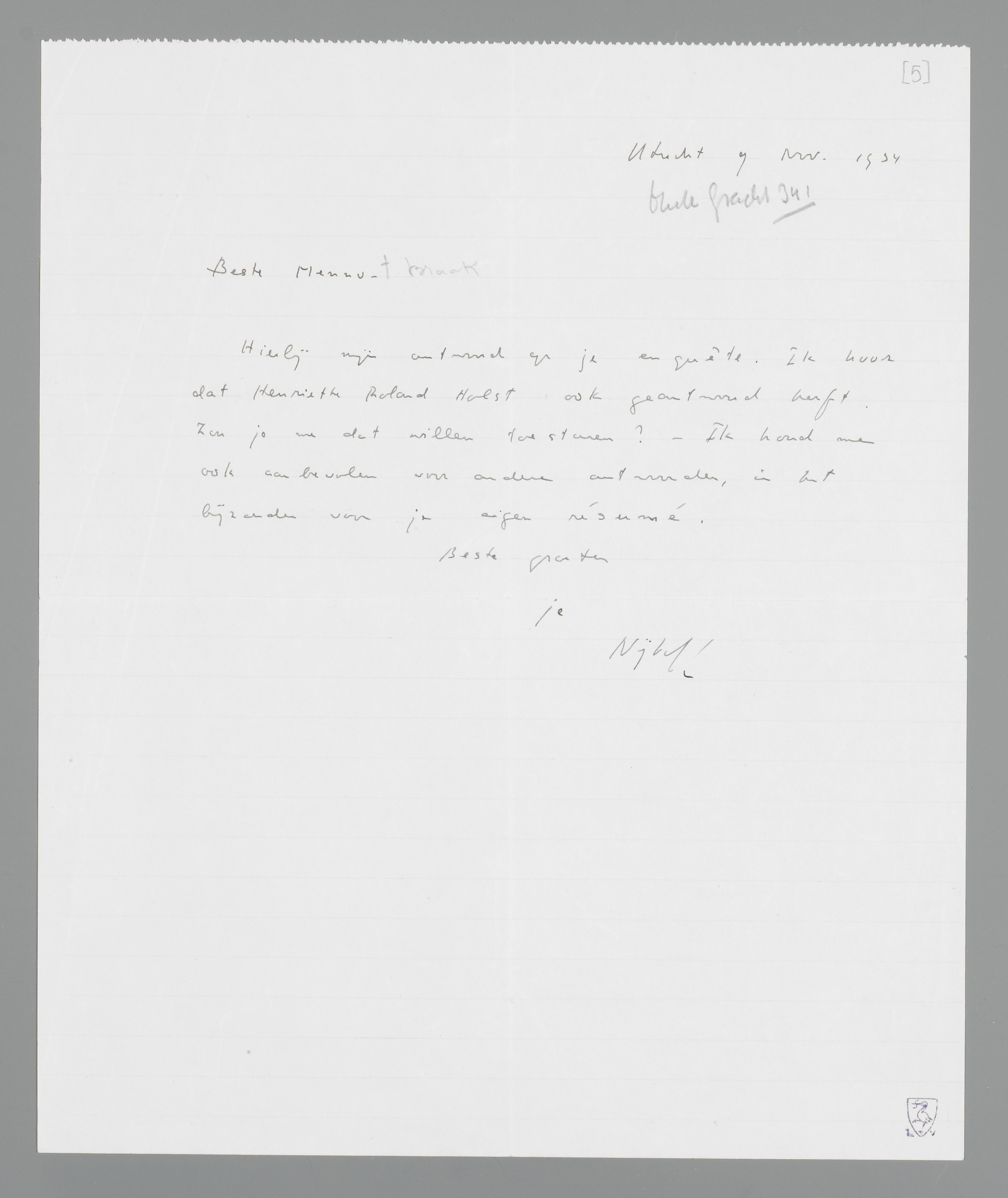 Hierbij mijn antwoord op je enquête. Ik hoor dat Henriette Roland Holst ook geantwoord heeft. Zou je me dat willen toesturen? - Ik houd me ook aanbevolen voor andere antwoorden, in het bijzonder voor je eigen résumé.
