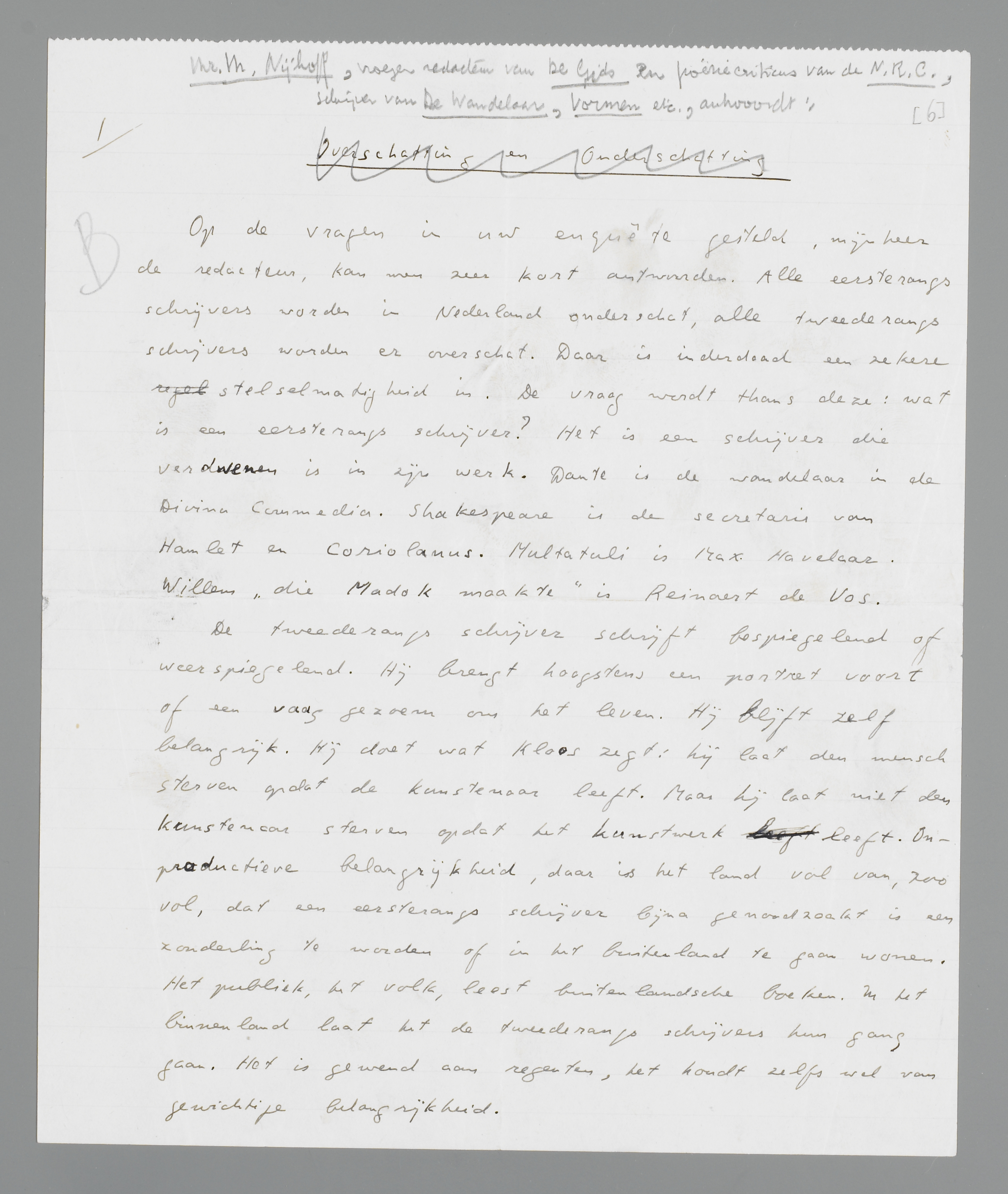 Op de vragen in uw enquête gesteld, mijnheer de redacteur, kan men zeer kort antwoorden. Alle eersterangs schrijvers worden in Nederland onderschat, alle tweederangs schrijvers worden er overschat. Daar is inderdaad een zekere stelselmatigheid in. De vraag wordt thans deze: wat is een eersterangs schrijver? Het is een schrijver die verdwenen is in zijn werk. Dante is de wandelaar in de Divina Commedia. Shakespeare is de secretaris van Hamlet en Coriolanus. Multatuli is Max Havelaar. Willem ‘die Madok maakte’ is Reinaert de Vos.