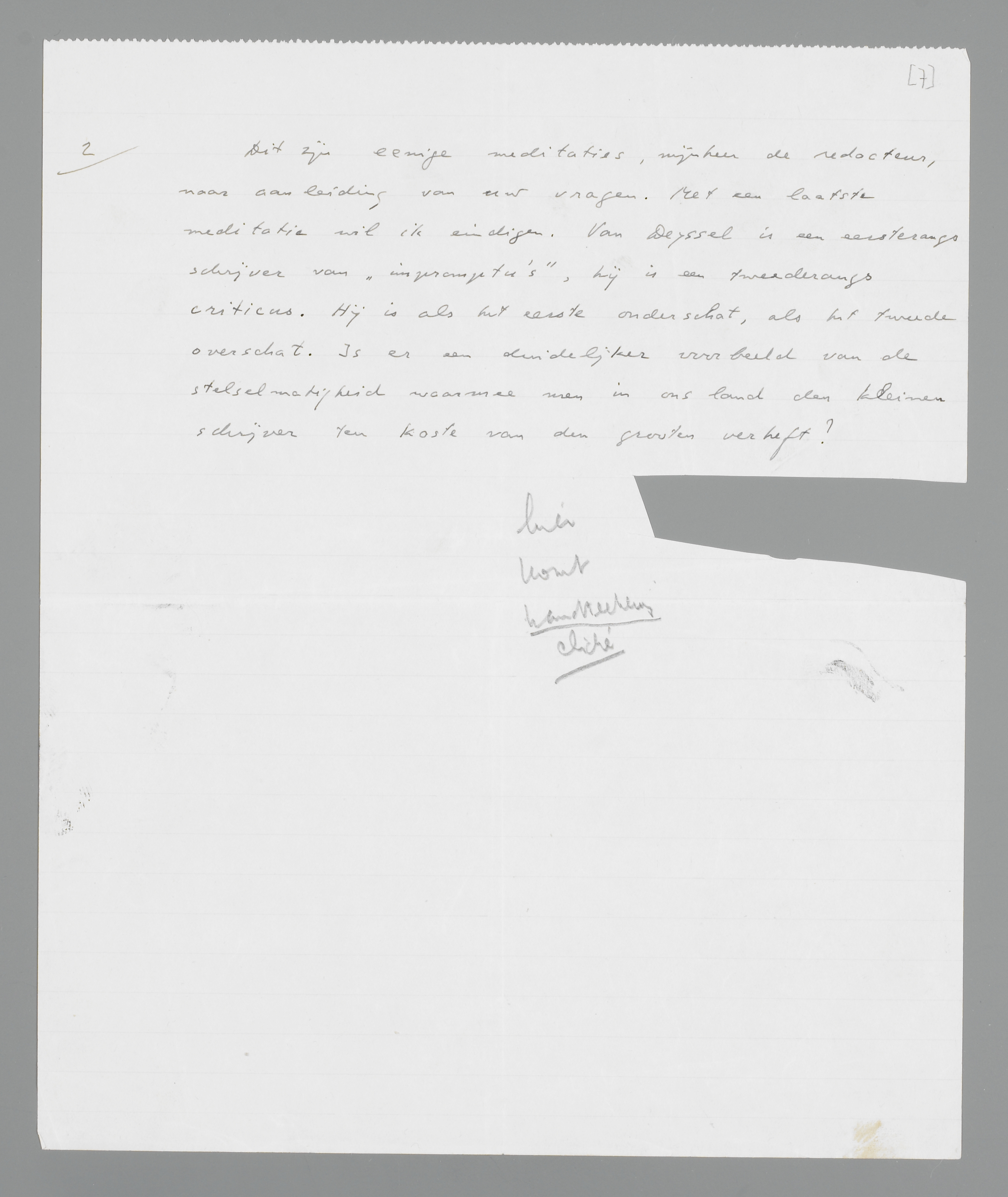 Dit zijn eenige meditaties, mijnheer de redacteur, naar aanleiding van uw vragen. Met een laatste meditatie wil ik eindigen. Van Deyssel is een eersterangs schrijver van ‘impromptu's’, hij is een tweederangs criticus. Hij is als het eerste onderschat, als het tweede overschat. Is er een duidelijker voorbeeld van de stelselmatigheid waarmee men in ons land den kleinen schrijver ten koste van den grooten verheft?